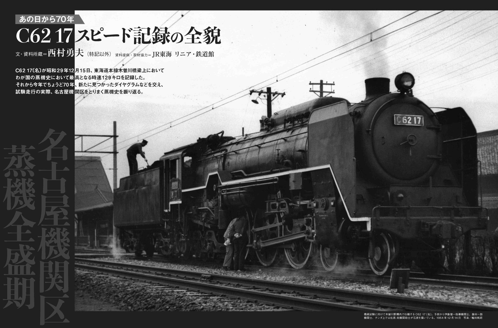 1954年12月15日、C62 17号機が東海道本線木曽川橋梁で時速129 kmを記録し、日本の蒸気機関車最高速度を達成。その舞台裏を、当時の関係者の証言や資料、写真を交えて振り返ります。また、JR東海 リニア・鉄道館に保存されている実機の取材や、20年前に行われたスピード記録関係者への貴重なインタビュー記事も掲載しています。