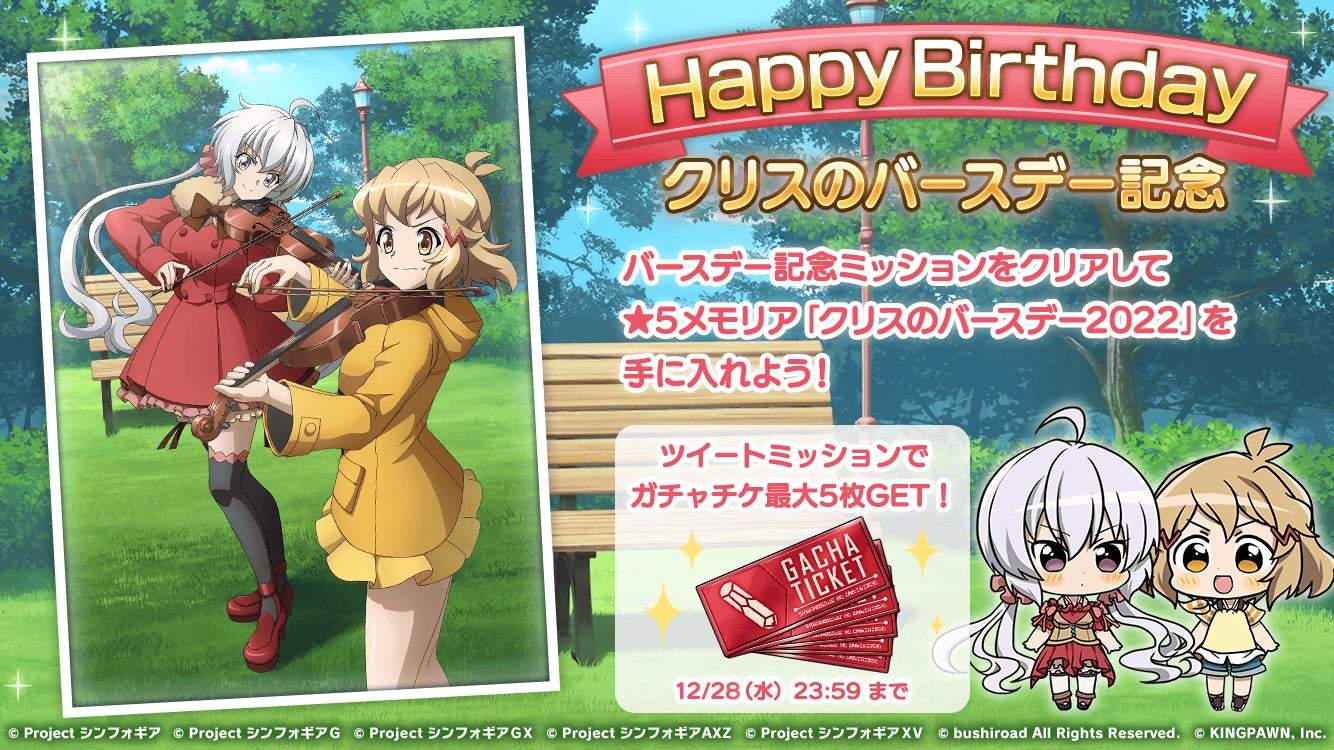 株式会社ブシロード(本社:東京都中野区、代表取締役社長:木谷高明)と株式会社キングポーン(本社:東京都中央区、代表取締役社長:清水祐一)は、好評配信中のスマートフォン向けゲームアプリ「戦姫絶唱シンフォギアXD UNLIMITED」にて、雪音クリスの誕生日を記念したキャンペーンを2022年12月28日(水)0:00より配信開始したことをお知らせします。