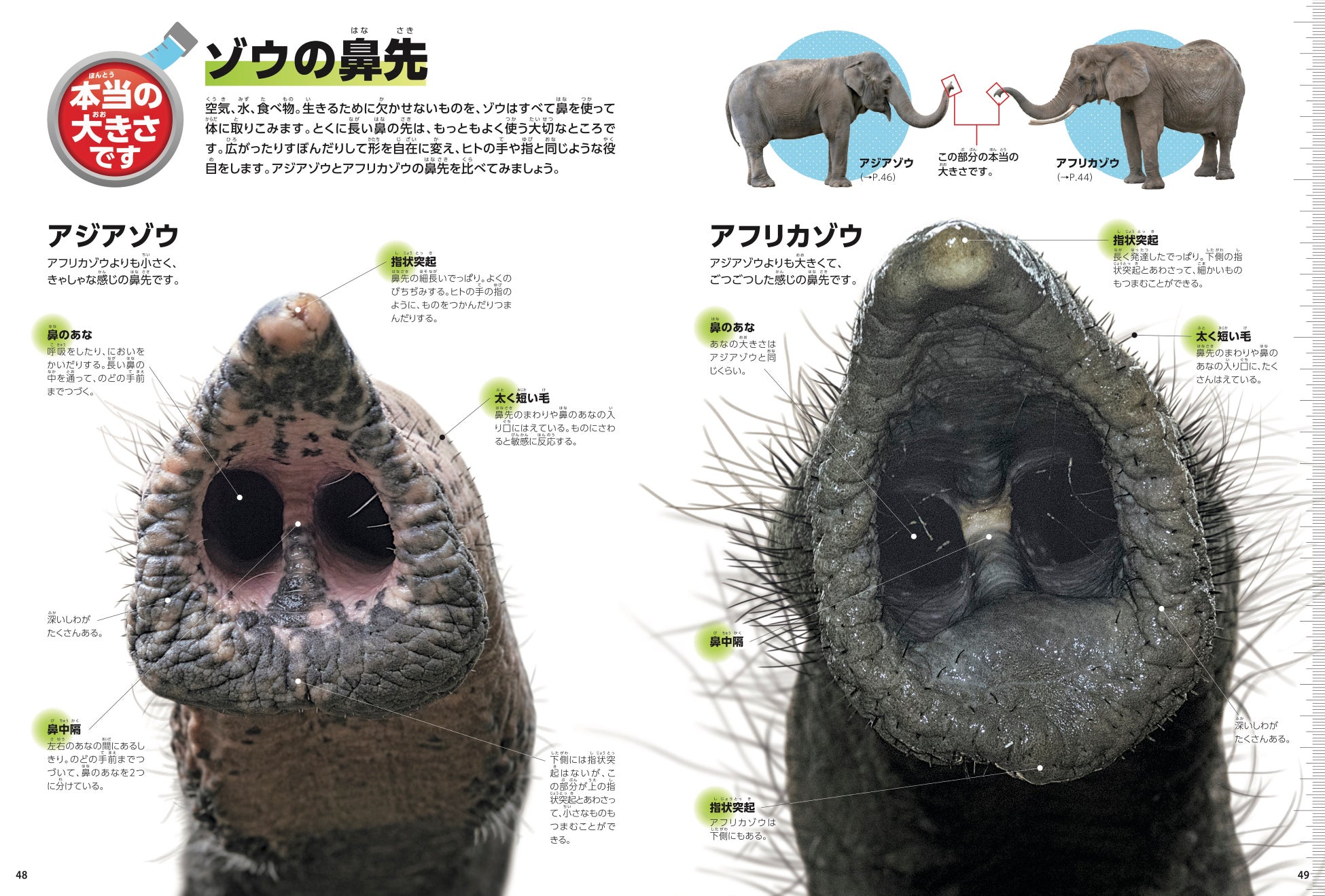 特集ページ「本当の大きさです」では、ゾウの鼻先やキリンの角を実物大でページに掲載! 実物大で見て、はじめてわかる情報が満載です。