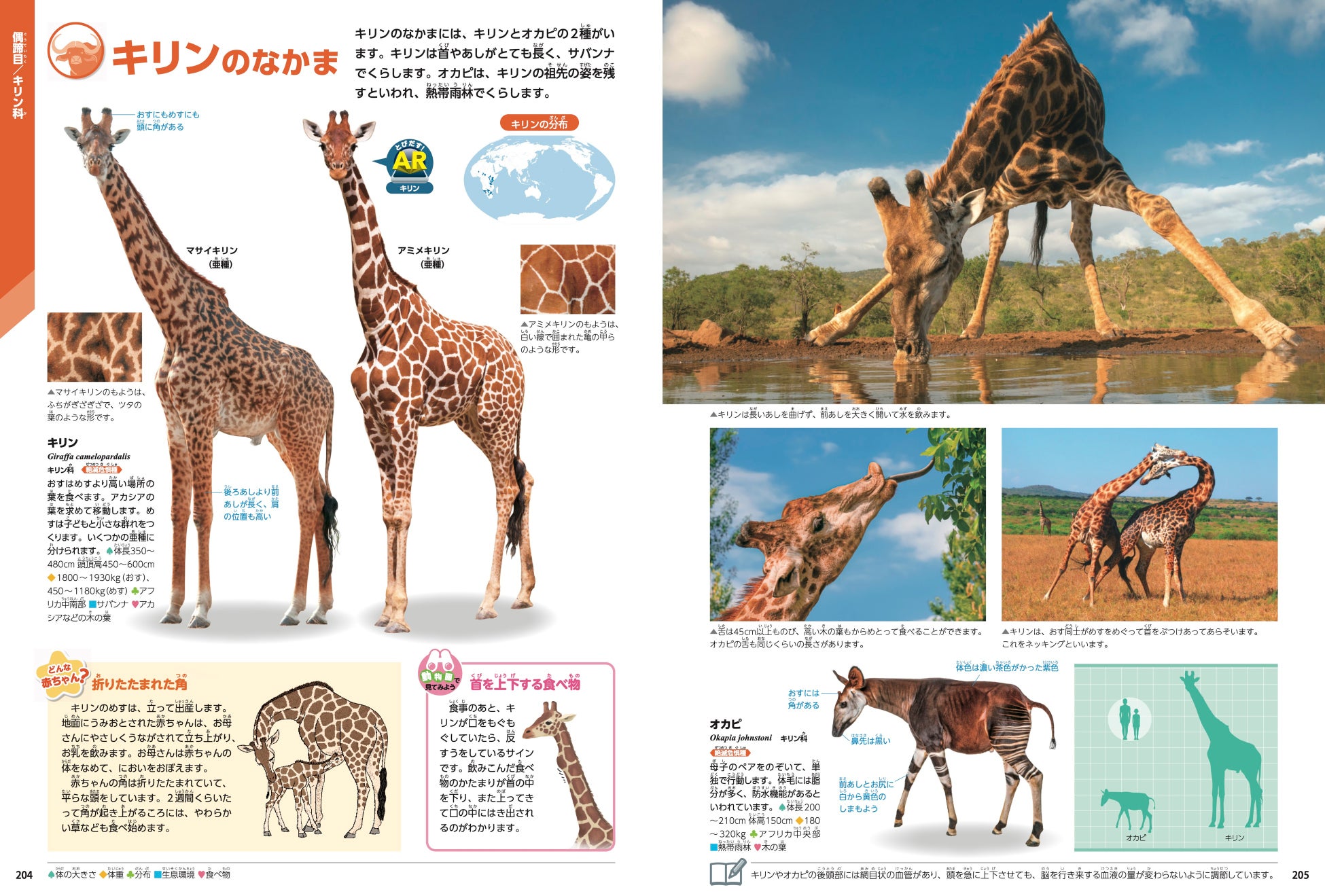各種の情報を掲載する図鑑ページ以外にも、子どもたちを飽きさせない多彩な特集ページがあります。ゾウやキリンなどの人気の動物たちも、切り口が変わると見え方が変わってきます。