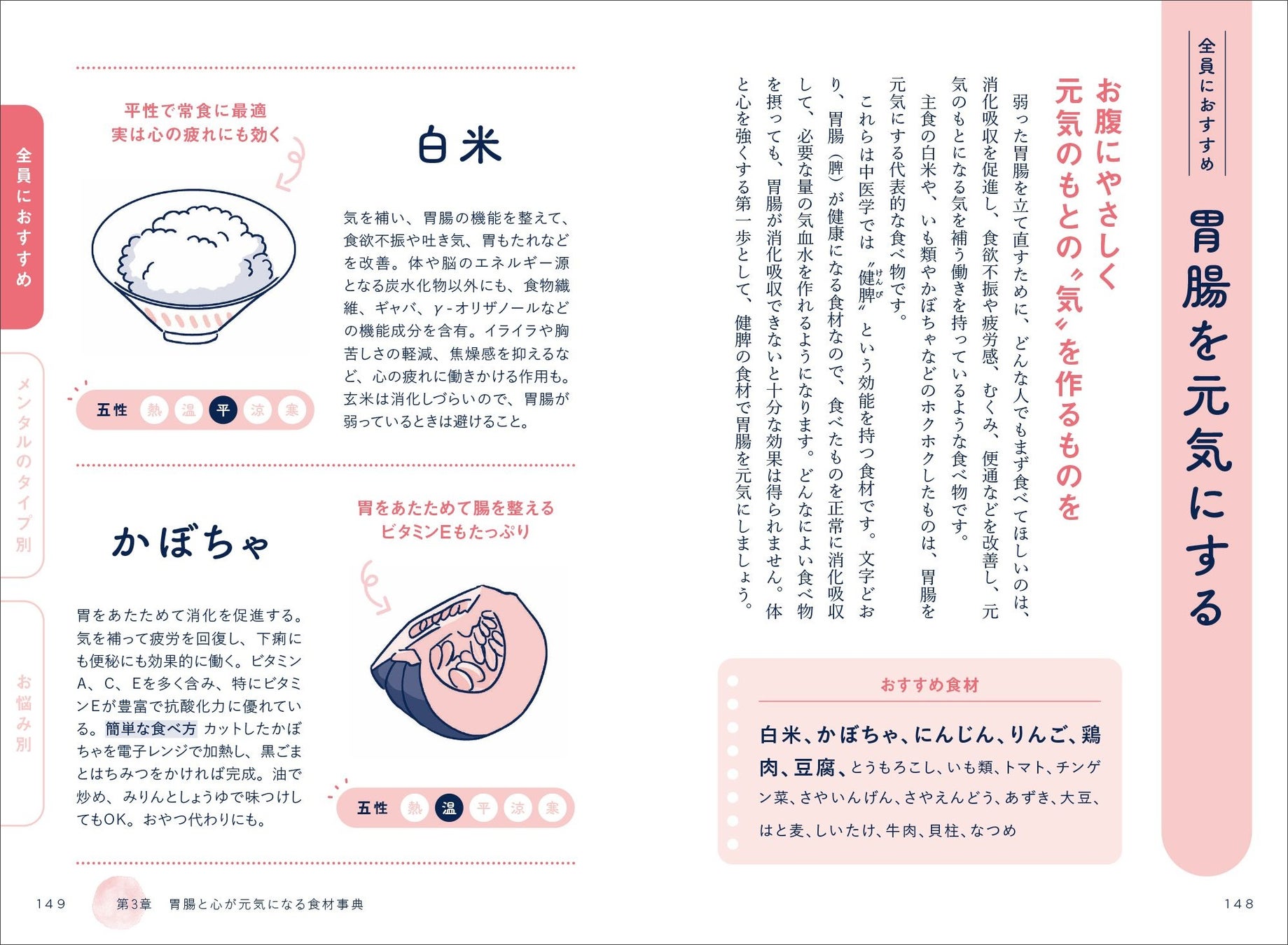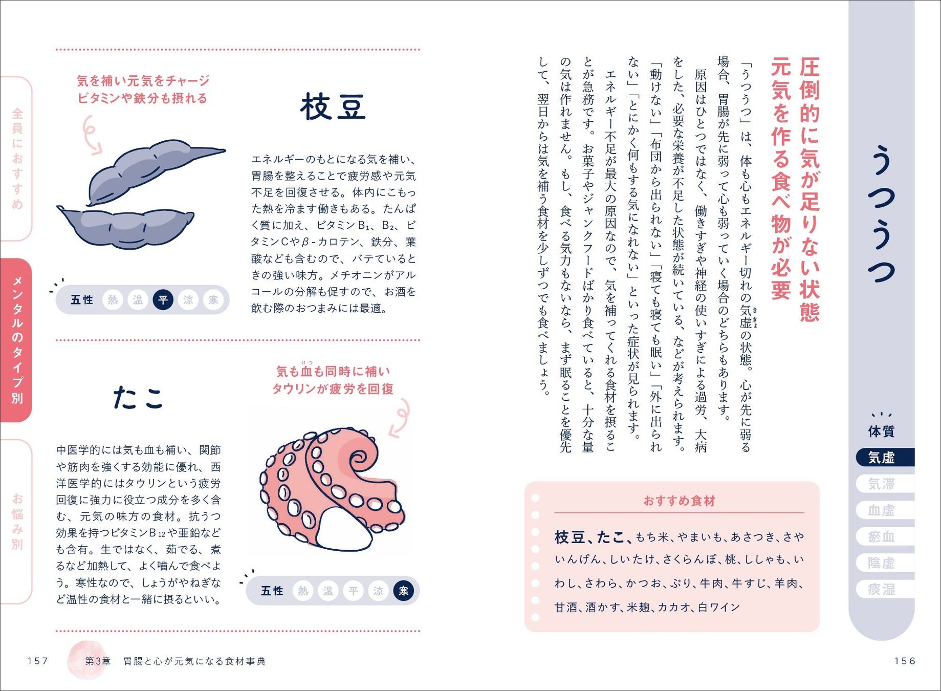 そこで、本書の第3章では、全員におすすめの「胃腸を元気にする食材」「心を安定させる食材」のほか、「うつうつ」「イライラ」「くよくよ」「ビクビク」「ざわざわ」「だるだる」「モヤモヤ」など、今のメンタルの状態(感情)に効く食材、さらに「ドカ食い」「食欲がない」「慢性疲労」「不眠」「めまい」「耳鳴り」「頭痛」「吐き気」といったメンタル不調で表れやすい体のお悩みに効く食材など、さまざまなメンタル不調・症状に対応できる「食べるクスリ」を多数紹介します。