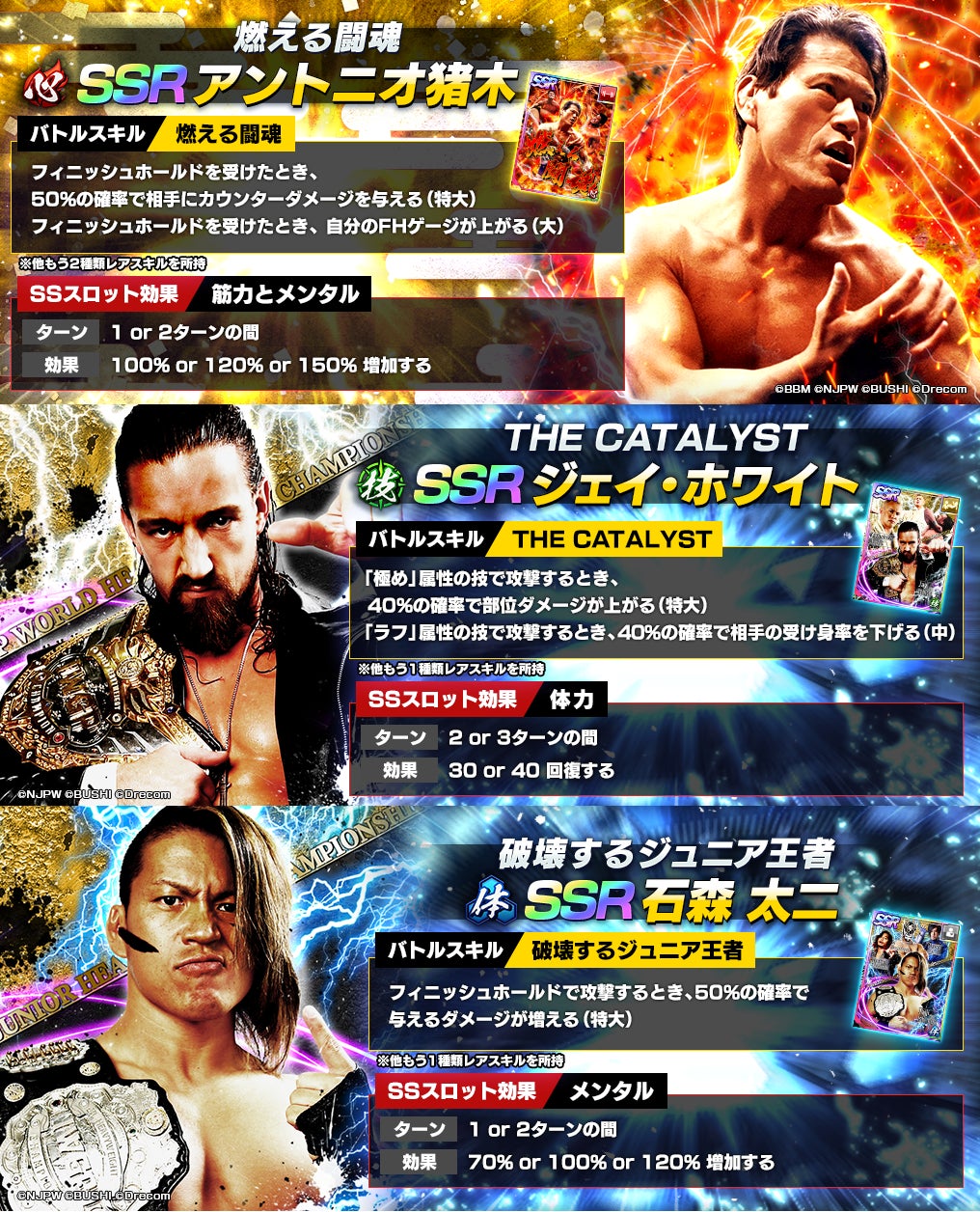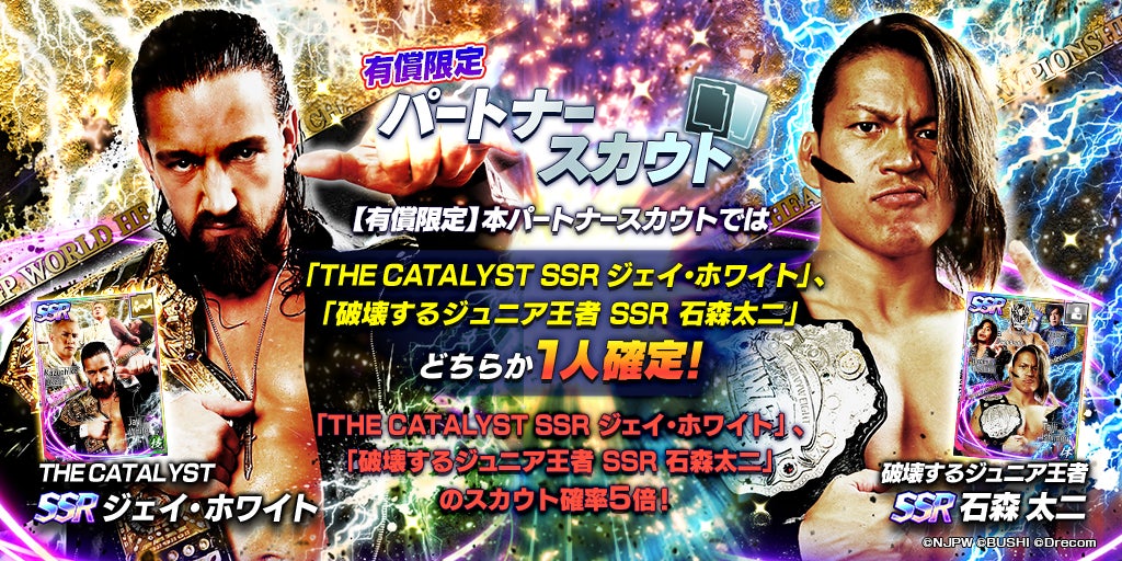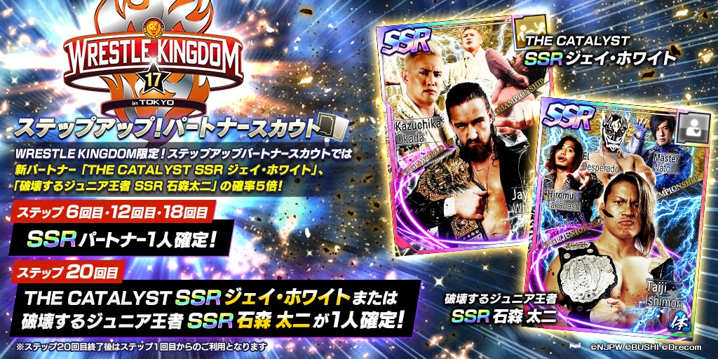 - SSR 「[THE CATALYST]ジェイ・ホワイト」と、SSR「 [破壊するジュニア王者]石森 太二」が登場するWRESTLE KINGDOM限定ステップアップパートナースカウトを開催!