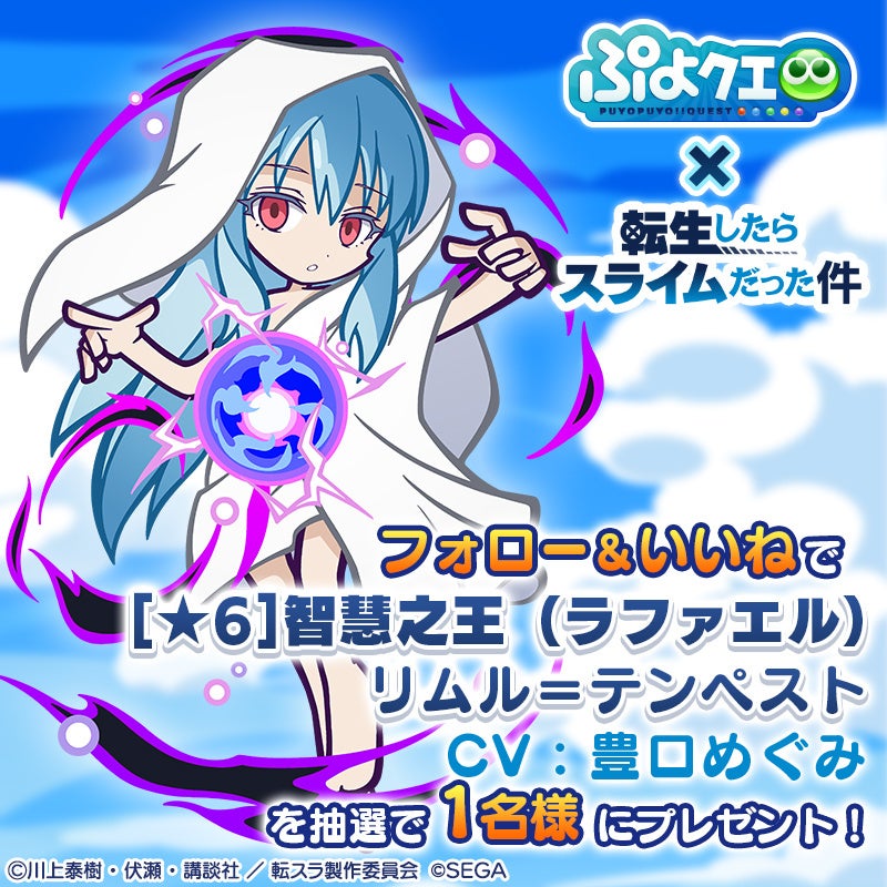 TVアニメ『転生したらスライムだった件』とのコラボイベント開催を記念して、『ぷよぷよ!!クエスト(ぷよクエ)』公式Xアカウントと公式Instagramアカウントにて、キャンペーンに参加した方の中から抽選で、コラボに登場するキャラクターをプレゼントするキャンペーンを順次開催中です。ぜひご参加ください。