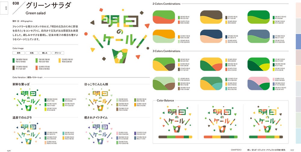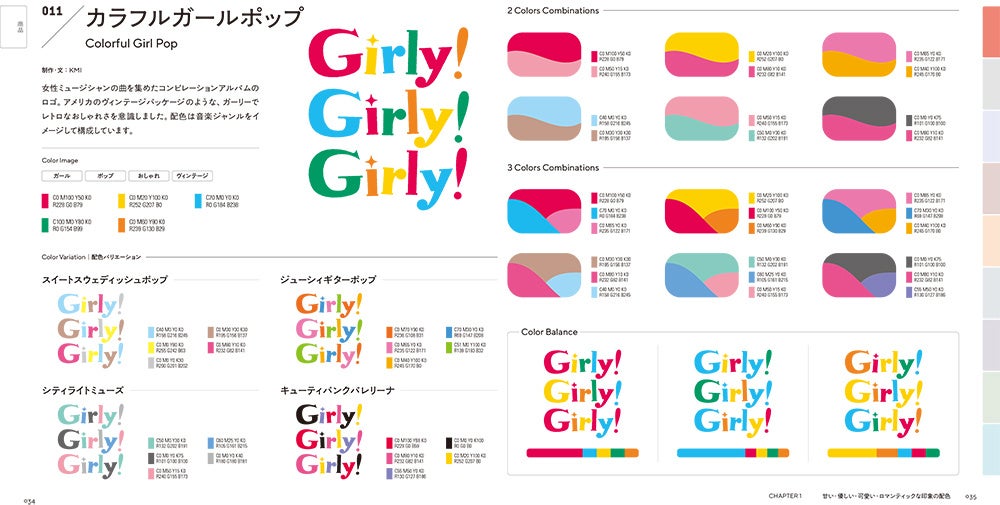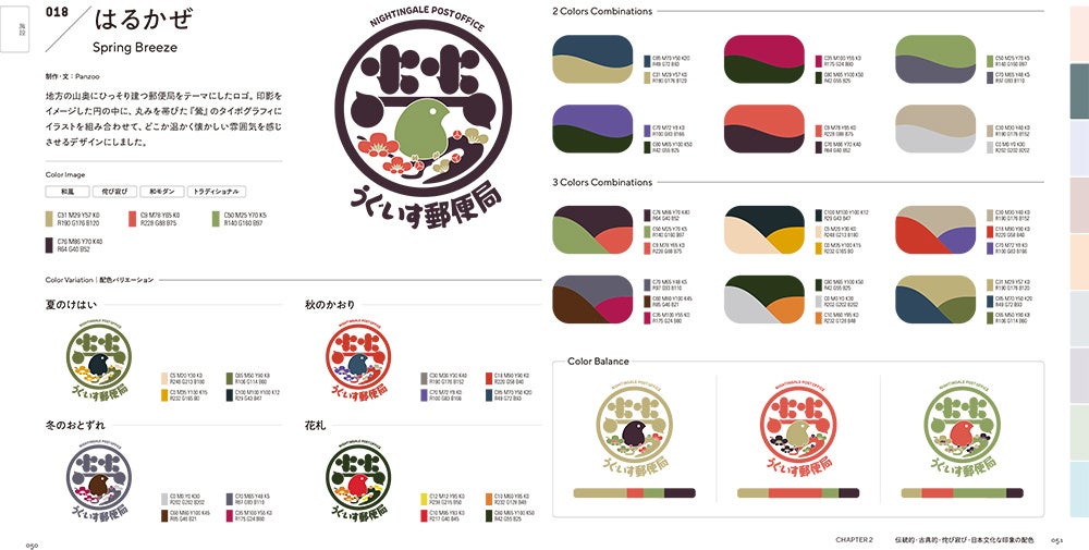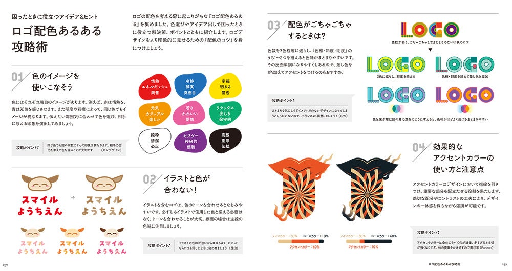収録されたロゴは110点! その配色バリエーションやカラーバランスを含めた配色アレンジを2,200点掲載しています。シンプルで直感的な配色のヒントから、クライアントワークで即活用できる応用テクニックまで、幅広いニーズに応える内容となっています。