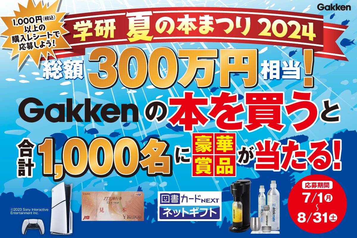 株式会社 学研ホールディングス(東京・品川/代表取締役社長:宮原博昭)のグループ会社、株式会社 Gakken(東京・品川/代表取締役社長:五郎丸徹)は、2024年7月1日(月)より「学研 夏の本まつり2024 総額300万円相当! Gakkenの本を買うと合計1,000名様に豪華賞品が当たる!」キャンペーンを開始いたしました。