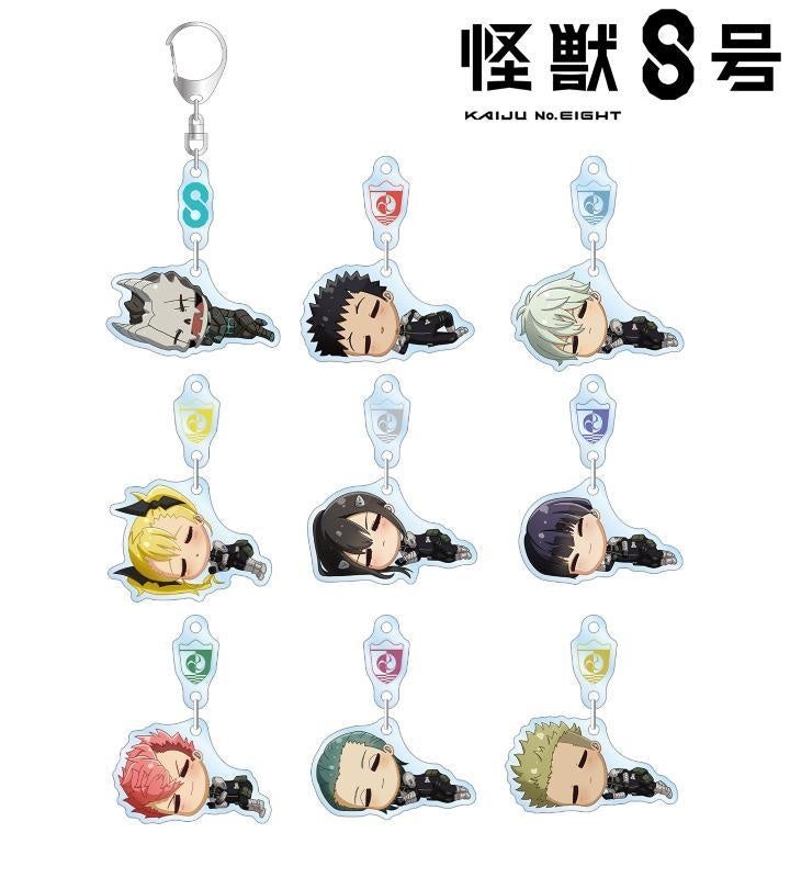 怪獣8号、日比野カフカ、市川レノ、四ノ宮キコル、亜白ミナ、保科宗四郎、古橋伊春、出雲ハルイチ、神楽木葵がころんと寝ているちびキャラを新たに描き起こし、ゆらゆら動くアクリルキーホルダーに仕上げました。