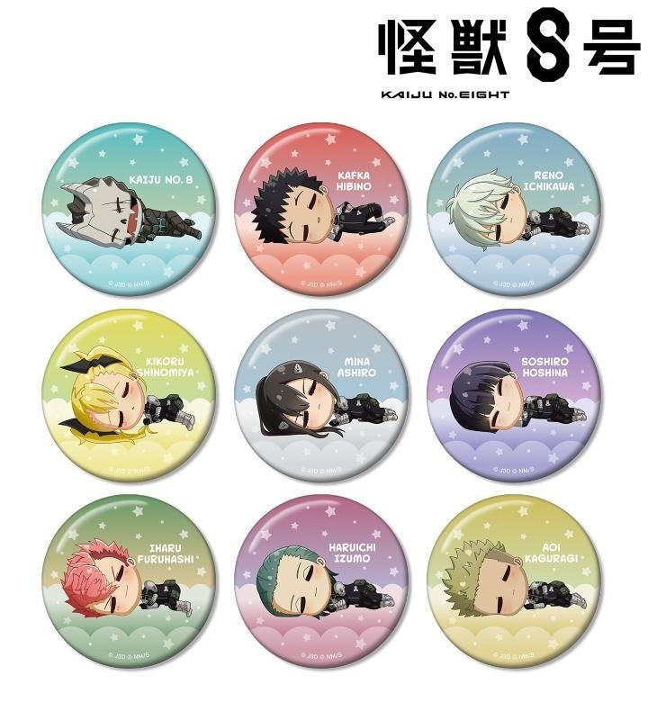 怪獣8号、日比野カフカ、市川レノ、四ノ宮キコル、亜白ミナ、保科宗四郎、古橋伊春、出雲ハルイチ、神楽木葵がころんと寝ているちびキャラを新たに描き起こし、缶バッジに仕上げました。
