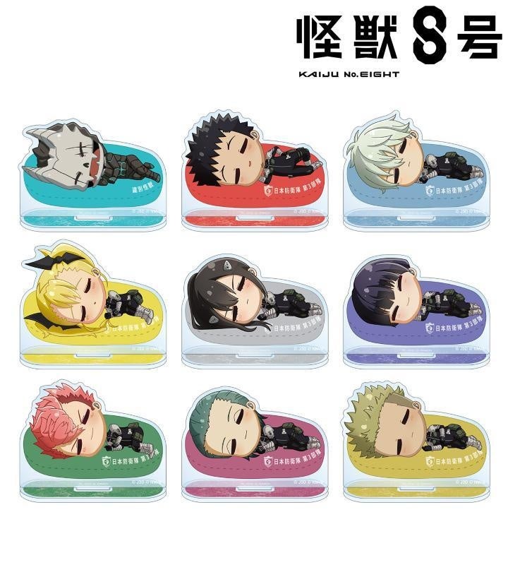 怪獣8号、日比野カフカ、市川レノ、四ノ宮キコル、亜白ミナ、保科宗四郎、古橋伊春、出雲ハルイチ、神楽木葵がころんと寝ているちびキャラを新たに描き起こし、アクリルスタンドに仕上げました。