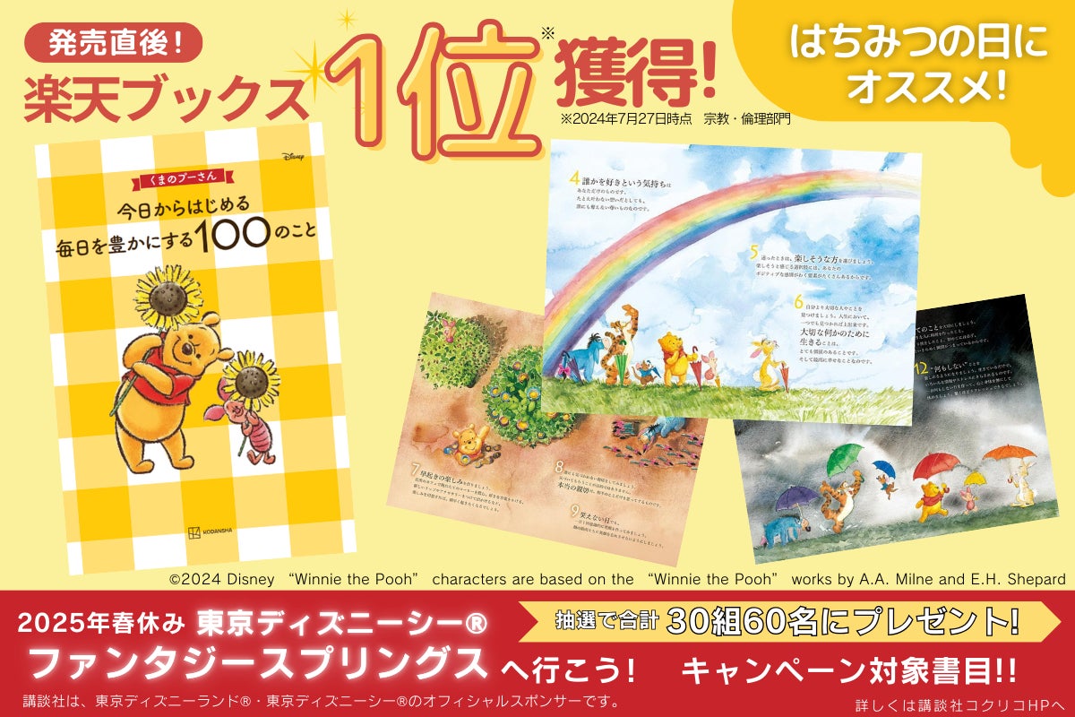 2024年7月24日に講談社より発売した『くまのプーさん 今日からはじめる 毎日を豊かにする100のこと』が、楽天ブックスにて1位(*)を獲得しました。