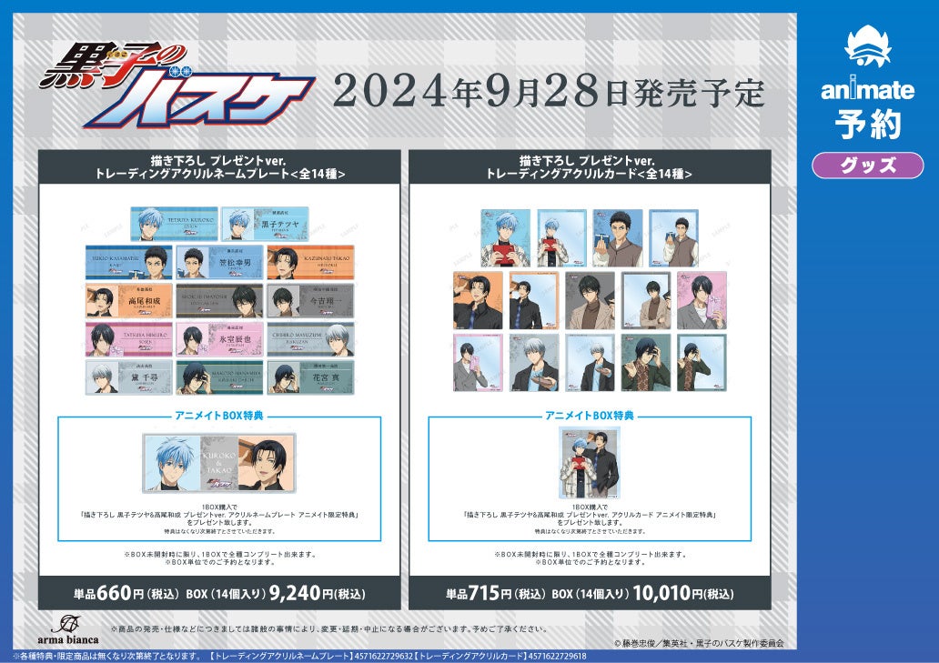 ※9月28日(土)より予約開始予定のECサイト「AMNIBUS」では、BOX購入特典として「描き下ろし 黒子テツヤ&黛 千尋 プレゼントver. アクリルネームプレート AMNIBUS限定特典」を予定しております。