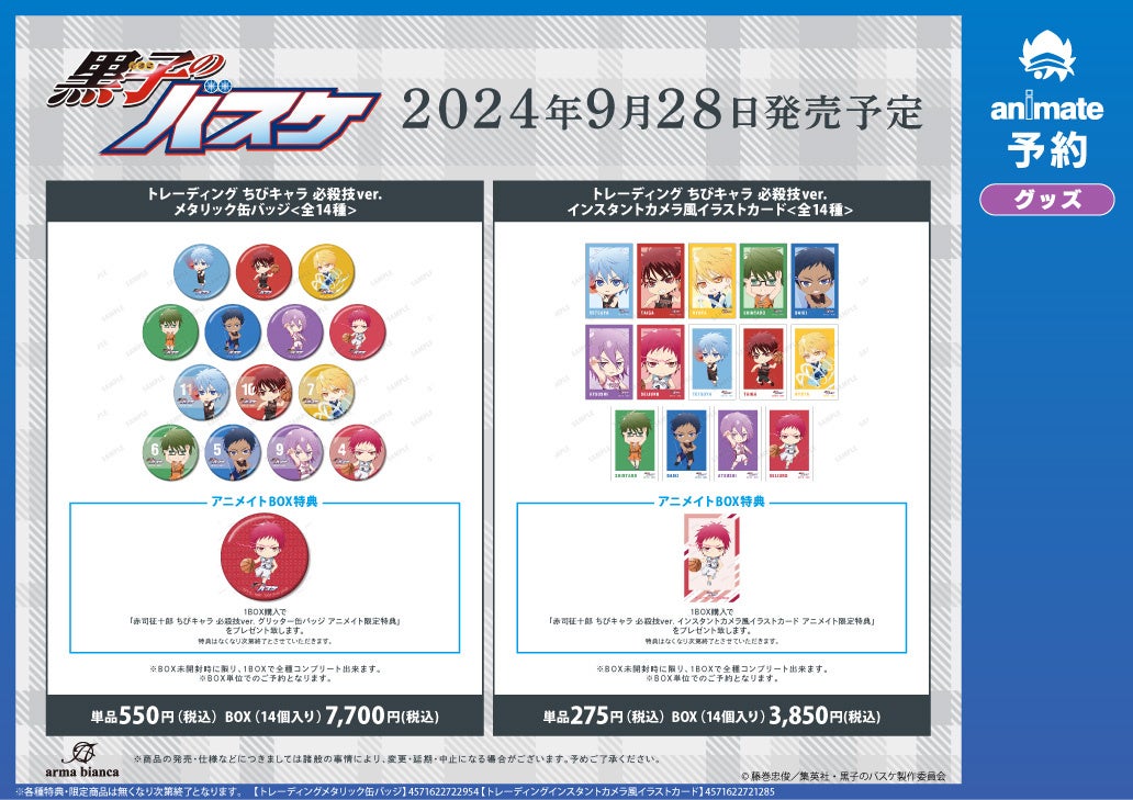 ※9月28日(土)より予約開始予定のECサイト「AMNIBUS」では、BOX購入特典として「黒子テツヤ ちびキャラ 必殺技ver. グリッター缶バッジ AMNIBUS限定特典」を予定しております。