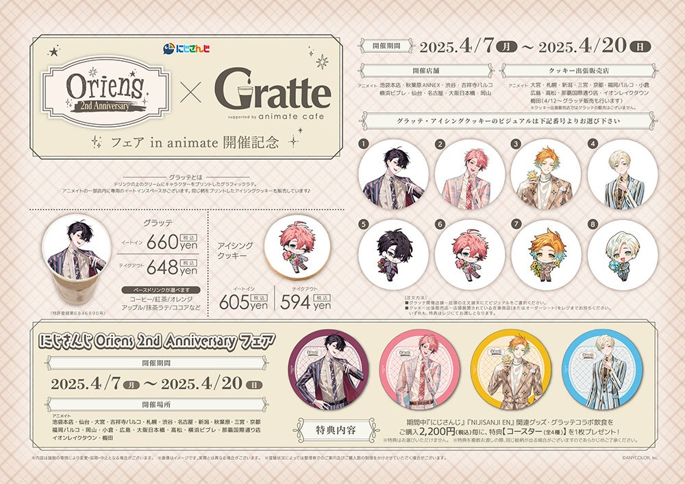 また、フェアにあわせて「ボイスアクリルスタンド」や「ランダムチェキ風カード」をはじめとしたグッズを販売するほか、フェアと同期間中にアニメイト一部店舗で「にじさんじ Oriens 2nd Anniversary フェア in animate 開催記念 × Gratte」を開催いたします。ドリンクの上のクリームにビジュアルをプリントしたグラフィックラテ“グラッテ”&アイシングクッキーをお楽しみいただけますので、こちらもお見逃しなく!