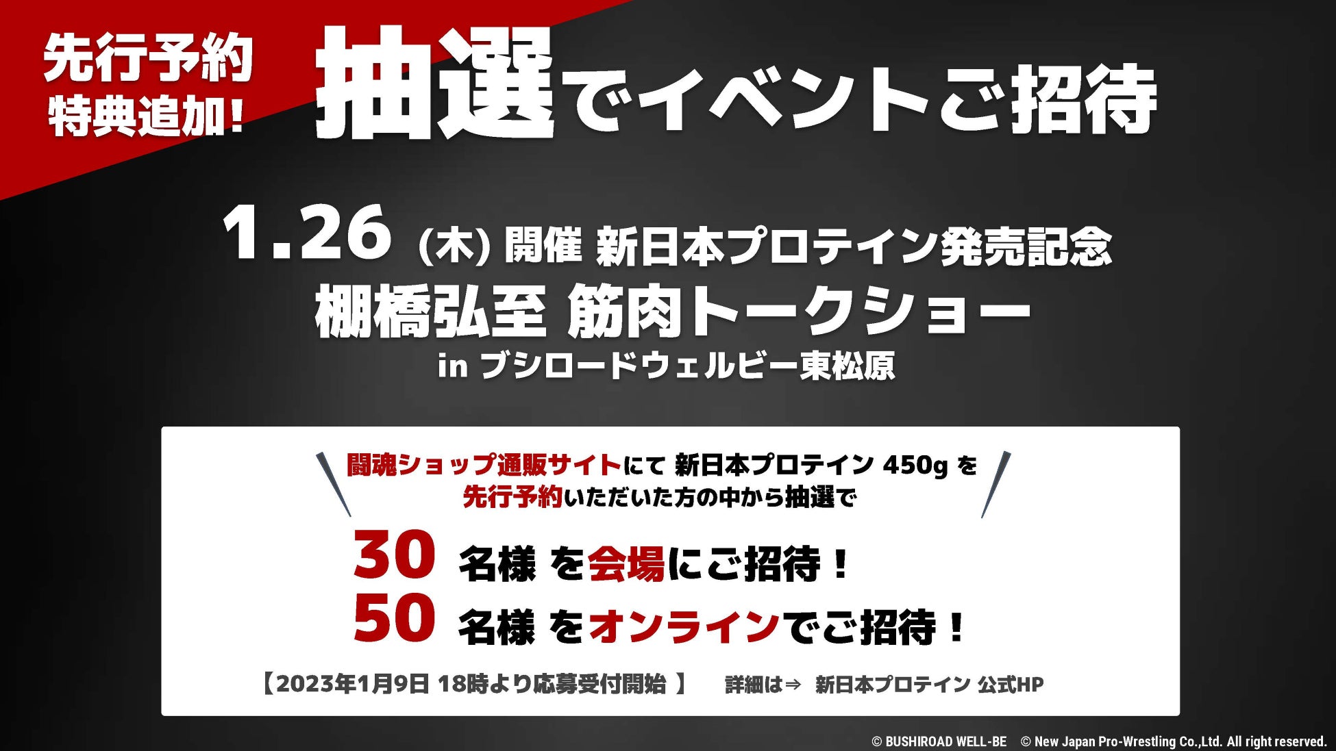 1月15日(日)までに新日本プロレスの通販サイト「闘魂SHOP」通販サイトで『新日本プロテイン(450g)』先行予約をお申込みいただいた方の中から抽選で30名様を会場にご招待、50名様をオンラインでご招待いたします!(要申込)