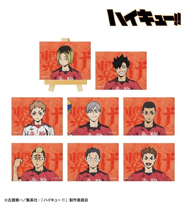 孤爪研磨、黒尾鉄朗、夜久衛輔、灰羽リエーフ、海 信行、山本猛虎、福永招平、犬岡 走のビジュアルと音駒高校の横断幕に掲げられた「繋げ」の文字をミニキャンバスボードに仕上げました。