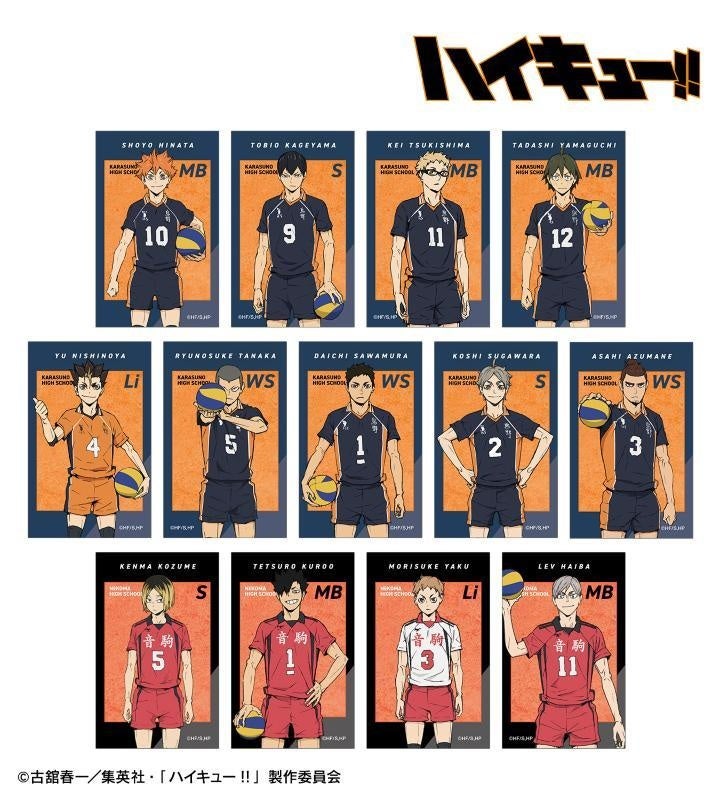 烏野高校の日向翔陽、影山飛雄、月島 蛍、山口 忠、西谷 夕、田中龍之介、澤村大地、菅原孝支、東峰 旭と音駒高校の孤爪研磨、黒尾鉄朗、夜久衛輔、灰羽リエーフのビジュアルをビジュアルカードに仕上げました。