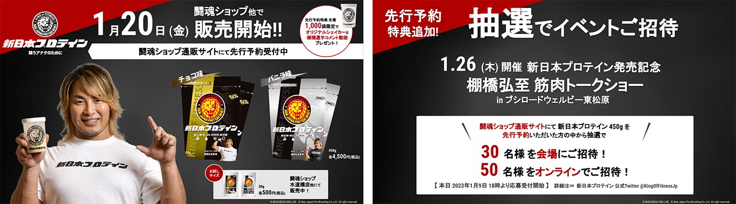 『新日本プロテイン』発売記念イベント「棚橋弘至 筋肉トークショー in ブシロードウェルビー東松原」を1 月26日(木)に開催いたします!1月15日(日)までに新日本プロレスの通販サイト「闘魂 SHOP」通販サイトで『新日本プロテイン(450g)』先行予約を
