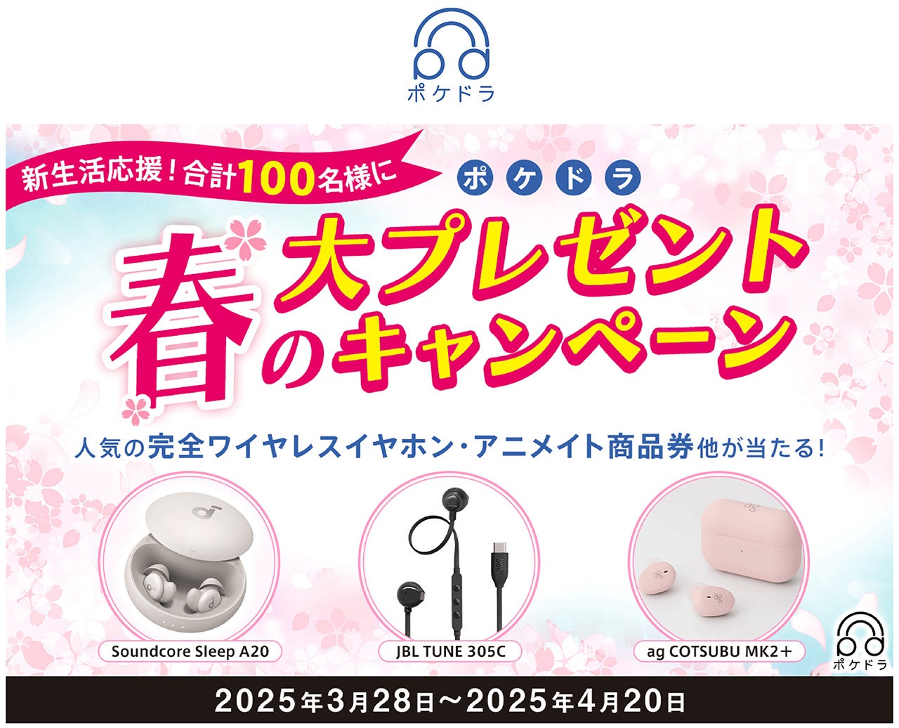 3月28日~4月20日まで開催する「ポケドラ春の大プレゼントキャンペーン!」では、ご応募いただいた方の中から抽選で合計100名様に、完全ワイヤレスイヤホン「Soundcore Sleep A20」や「ag COTSUBU MK2+」、ハイレゾ対応有線インイヤーヘッドホン「JBL TUNE 305C」、モバイルバッテリー / USB急速充電器「Anker 511 Power Bank (PowerCore Fusion 30W)」、その他「アニメイト商品券」、「アニメイトポイント」といった豪華景品をプレゼントいたします。