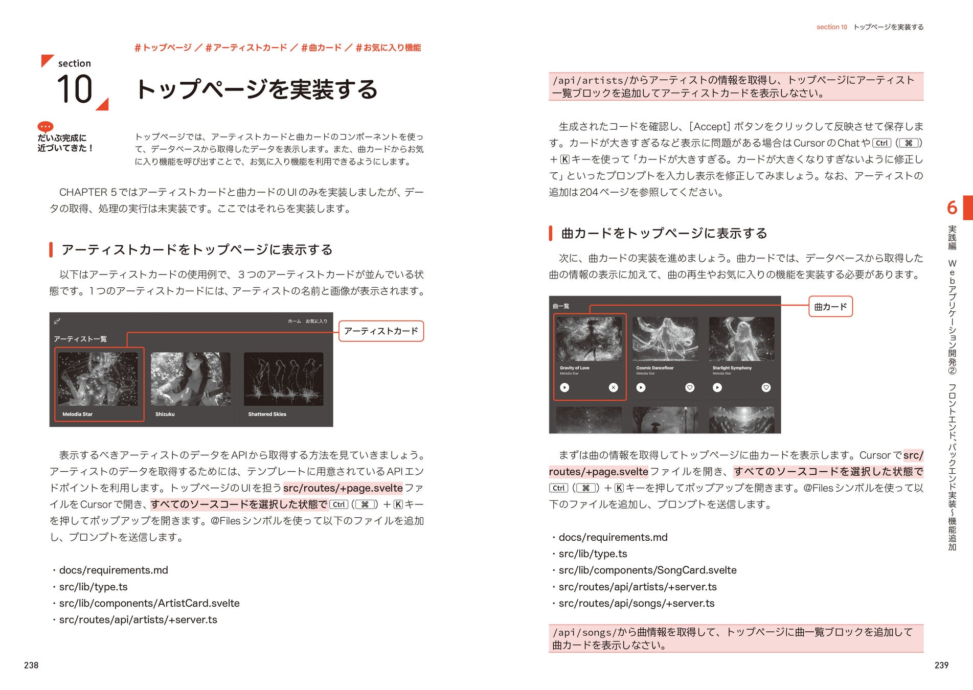 本書では、AIコードエディターCursor(カーソル)を使ったAI駆動開発のノウハウを学んでいきます。大きく準備編、基礎編、実践編の3つのパートで構成しており、準備編ではCursorなど開発環境の導入を行い、基礎編ではオセロ、2048などのシンプルなパズルゲームを開発。その後の実践編では音楽配信サービス的なWebアプリケーション開発を通じて本格的なAI駆動開発を体験します。開発における多数のプロセスをAIによって効率化し、エンジニアの生産性をアップする手法がしっかり身につきます。また、本書では開発用のテンプレートと完成例を用意してあるので、開発の経験が少ない人でも取り組みやすくなっています。