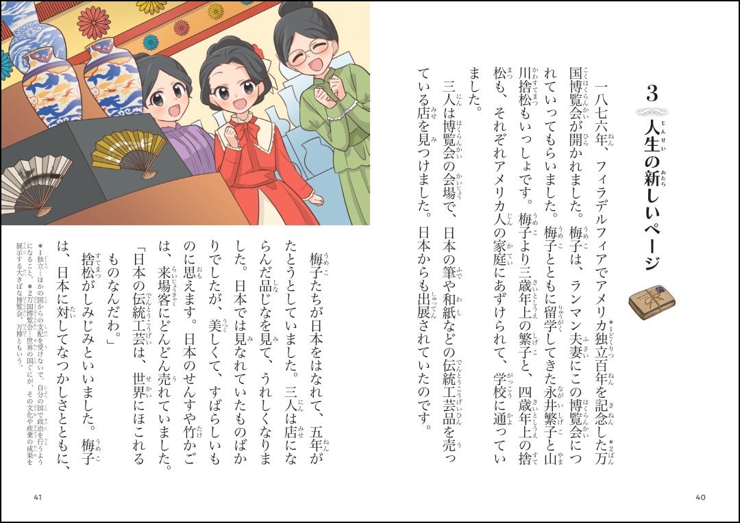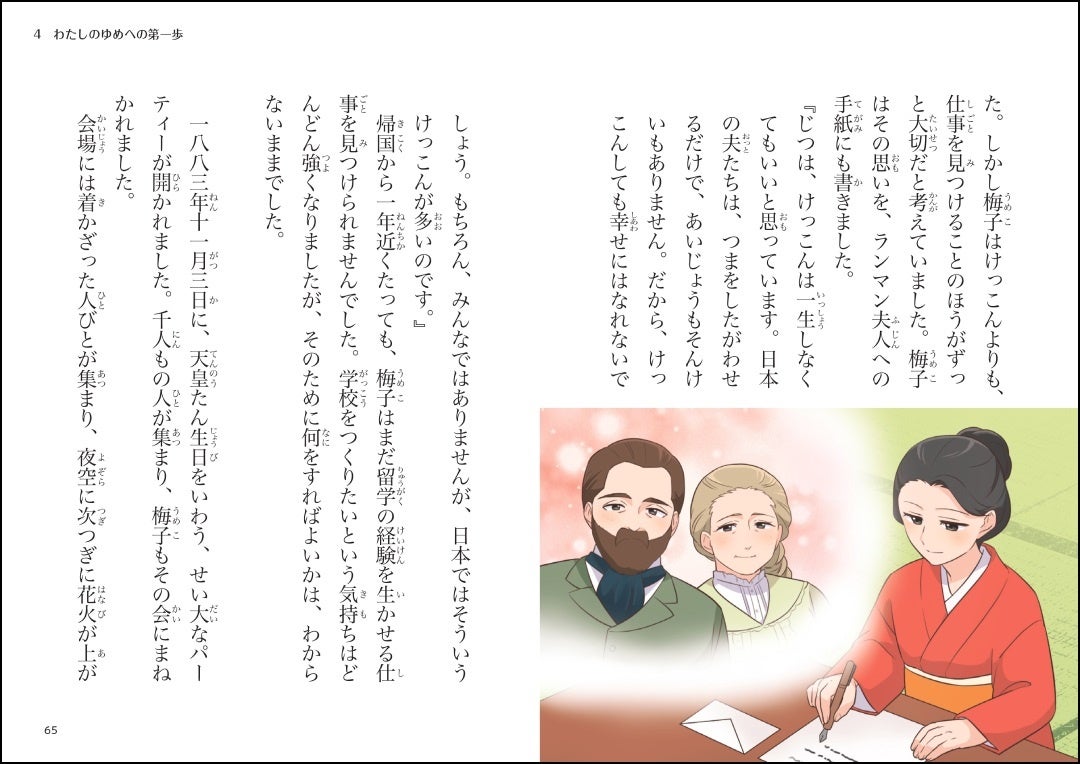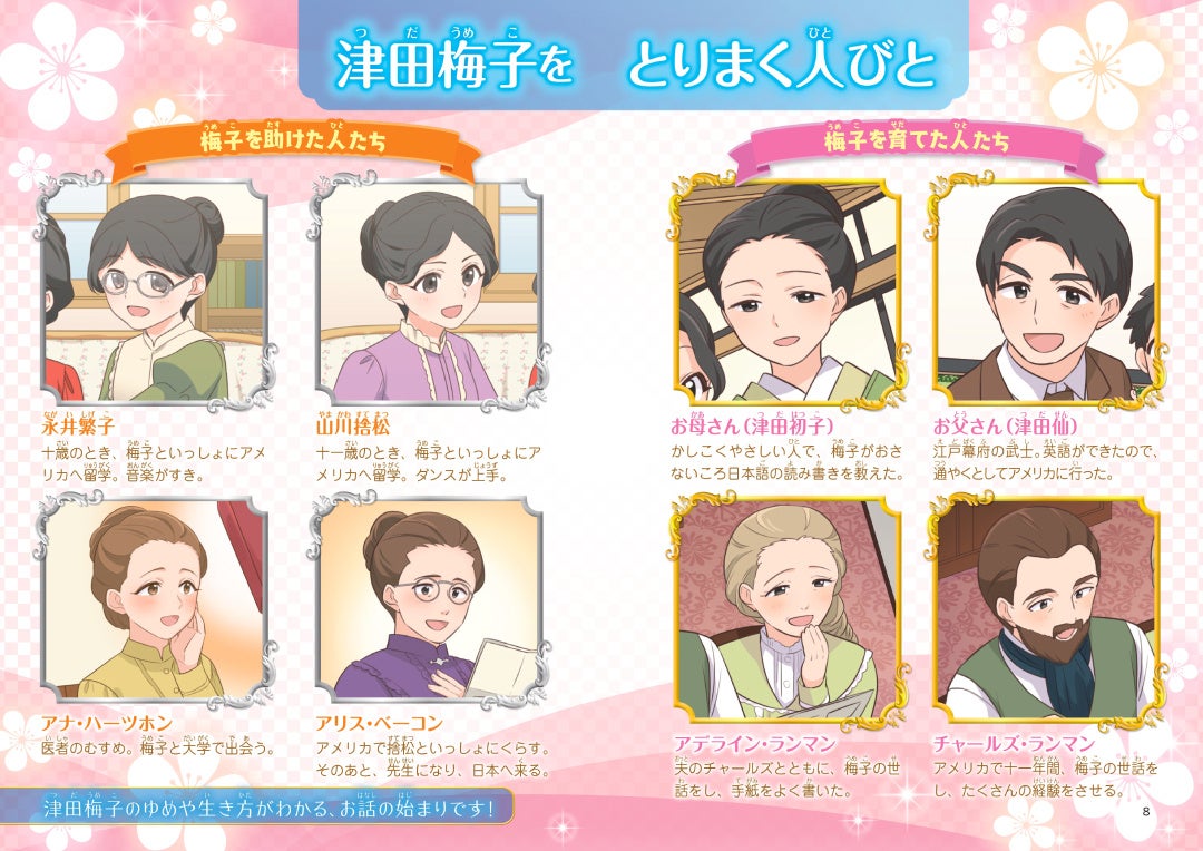巻頭に図解ぺージつき。津田梅子や、本文に登場する人物の紹介、活躍した場所やその当時の様子、子ども時代から晩年までの流れがひとめでわかります。本文を読む前にイメージがわきます。