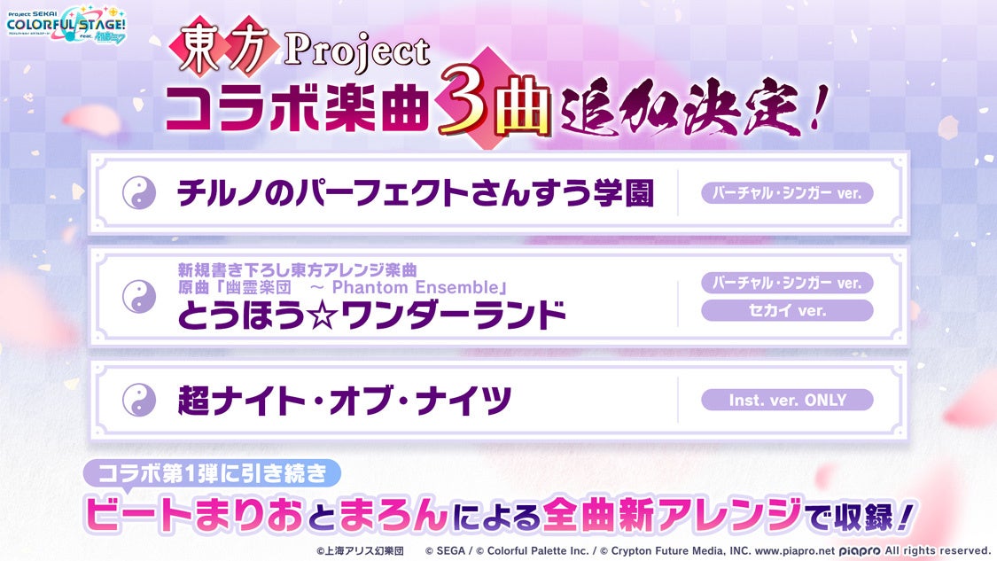 2025年5月上旬より、「東方Project」とのコラボ第2弾が決定いたしました。新たなリズムゲーム楽曲として、コラボ第1弾に引き続きビートまりおチームによるアレンジが加わった以下3曲が追加予定です。