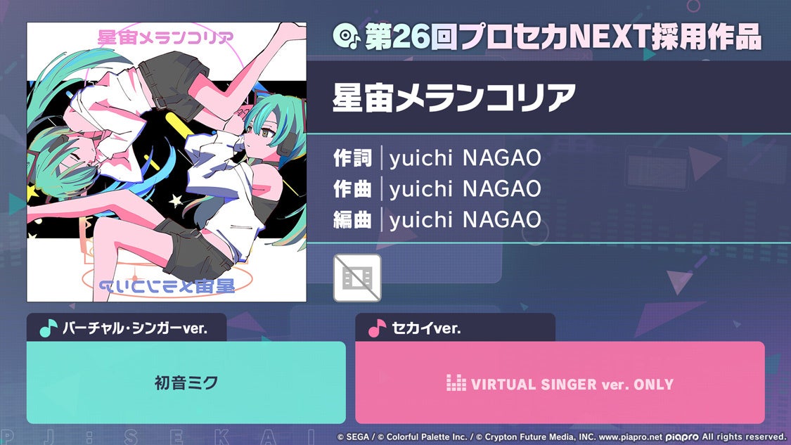 新たなリズムゲーム楽曲として、以下4曲の追加が決定いたしました。「星宙メランコリア」(作詞・作曲:yuichi NAGAO)は、「一緒に作ろう!第26回楽曲コンテストプロセカNEXT」の採用作品となります。