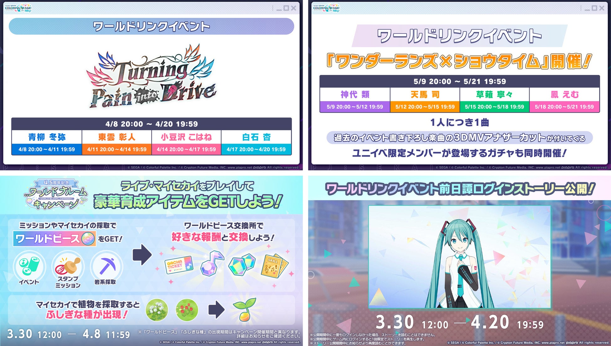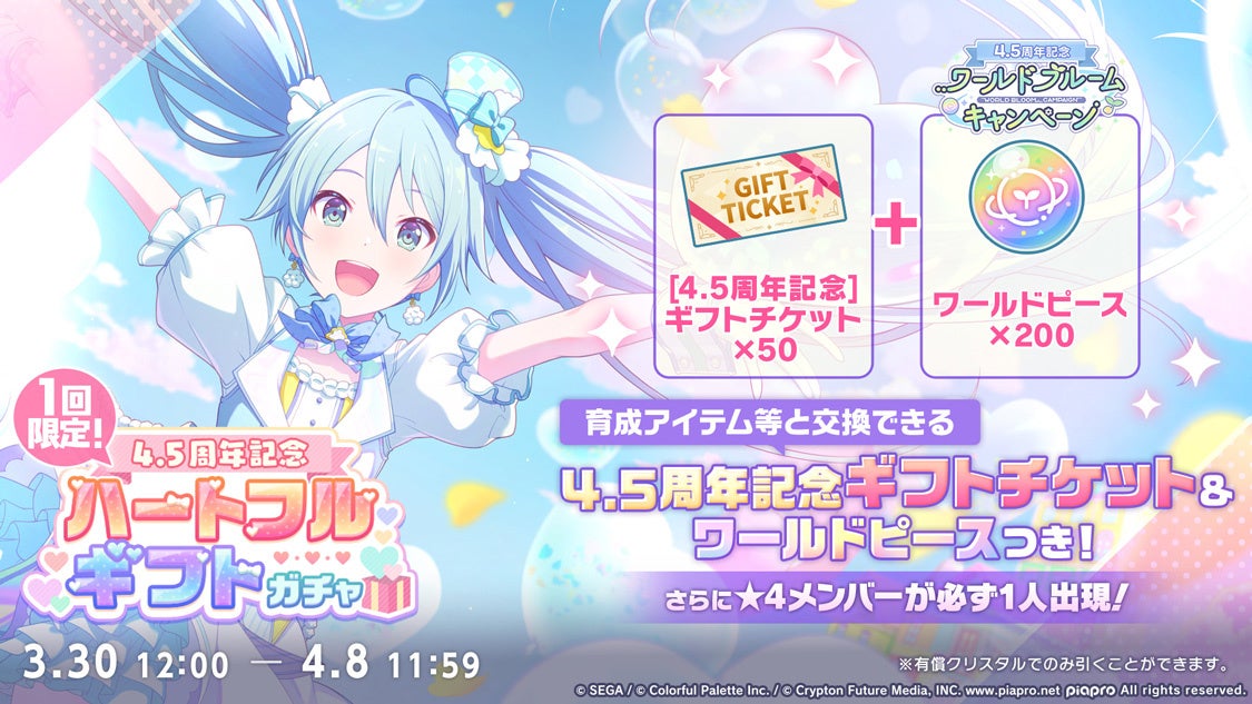 また、2025年3月30日(日)より、4.5周年を記念し、ワールドリンクイベントを応援する「ワールドブルームキャンペーン」を開催いたします。本キャンペーンでは、ライブや「マイセカイ」でのプレイを通じて、さまざまな育成アイテムを獲得することができるほか、イベントやミッション、「マイセカイ」の岩系素材の採取によって手に入る「ワールドピース」を集めると、「ワールドピース交換所」にて「[4.5周年記念]★4メンバー確定ガチャチケット」や「想いの純結晶」などの豪華報酬と交換することができます。さらに、「マイセカイ」の植物を採取すると、一定確率で「ふしぎな種」がドロップする特別仕様も実施予定です。