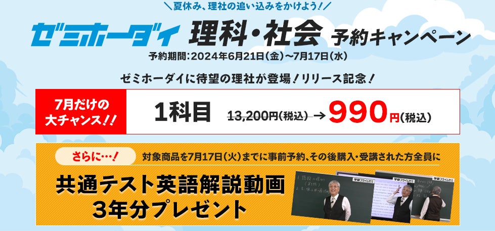 「ゼミホーダイ」の理科・社会科目リリースを記念し、受講予約で共通テスト対策の特典映像を視聴できるキャンペーンを実施します。