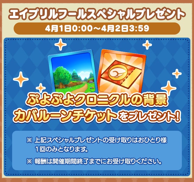 内容:1回限定で「エイプリルフール スペシャルプレゼント」を開催します。忘れずにログインして「ぷよぷよクロニクルの背景」や「カバルーンチケットガチャ」を引ける「カバルーンチケット」を手に入れましょう!