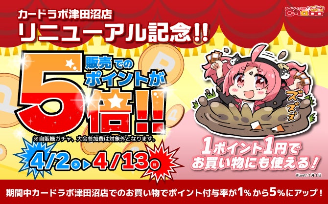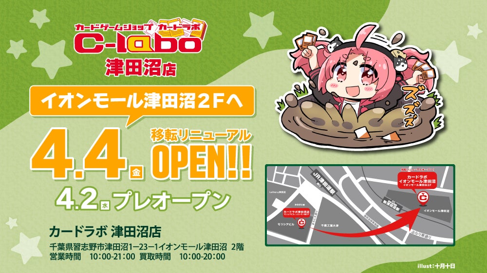 株式会社カードラボ (本社:東京都豊島区 https://www.c-labo.jp/)は、トレーディングカードゲーム専門店「カードラボ津田沼店」を2025年4月4日(金)10:00よりイオンモール津田沼にて移転リニューアルオープンいたします。