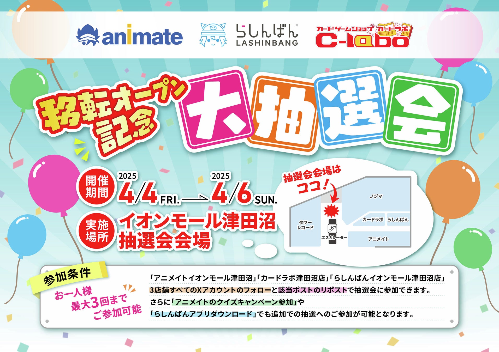 アニメイト・らしんばん・カードラボの3社で移転オープンを記念して、「移転オープン記念 大抽選会」実施します!
