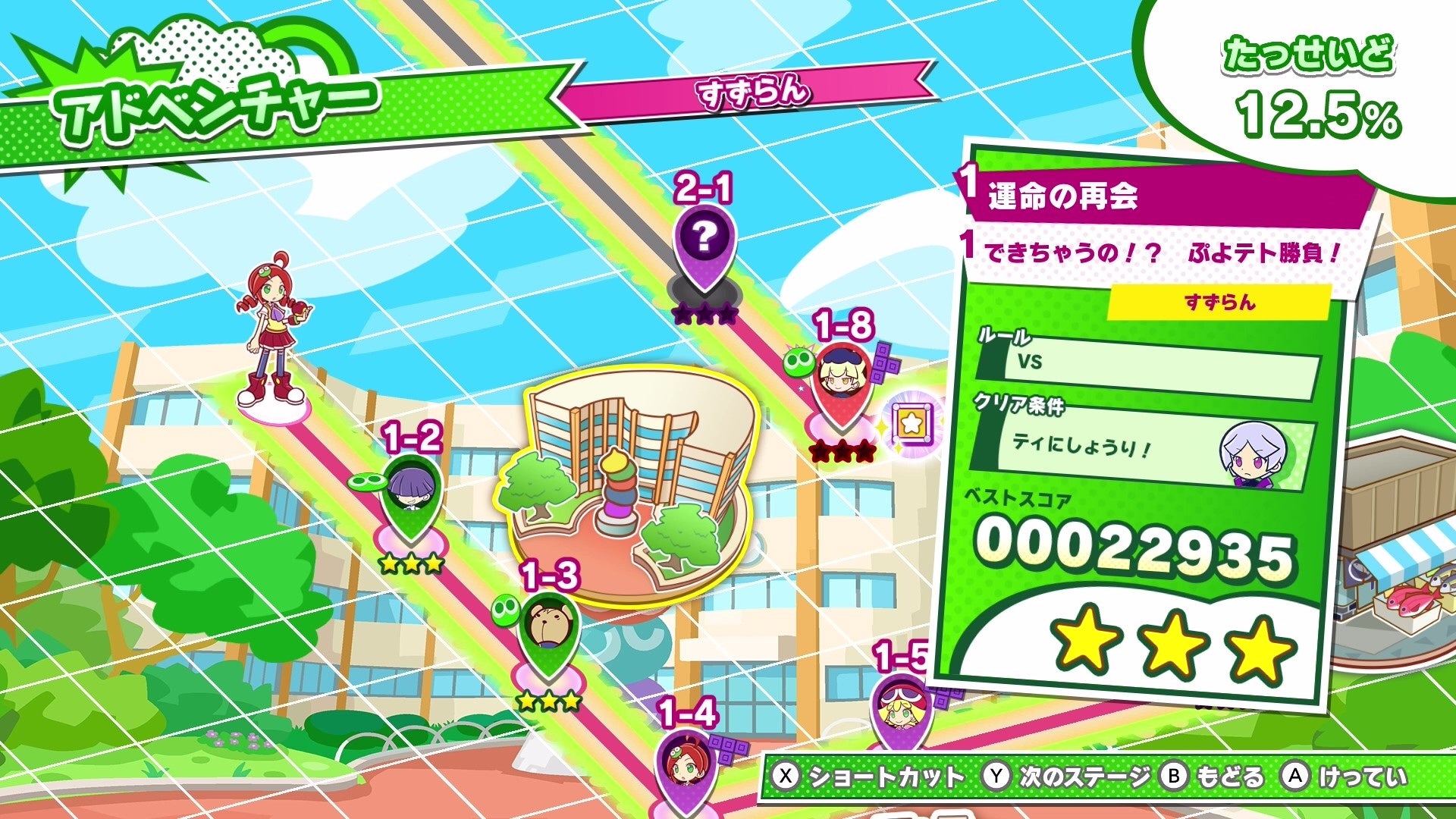 「アドベンチャー」モードでは、マップを移動し対戦やミッションの攻略をしながらストーリーを進めていきます。「ぷよぷよ」と「テトリス」が混ざった世界で展開される、パズルの冒険に出発しましょう!