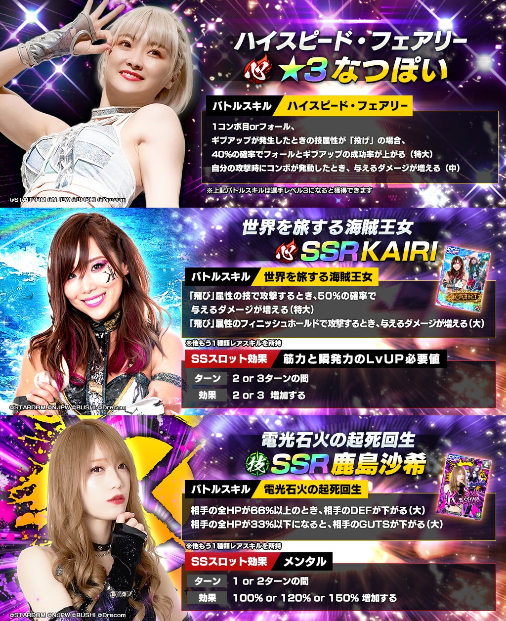 新日SSにスターダムから★3選手なつぽい、SSR KAIRI、SSR 鹿島沙希が登場!さらに、実装を記念して全ユーザー様へダイヤ1500個を配布!