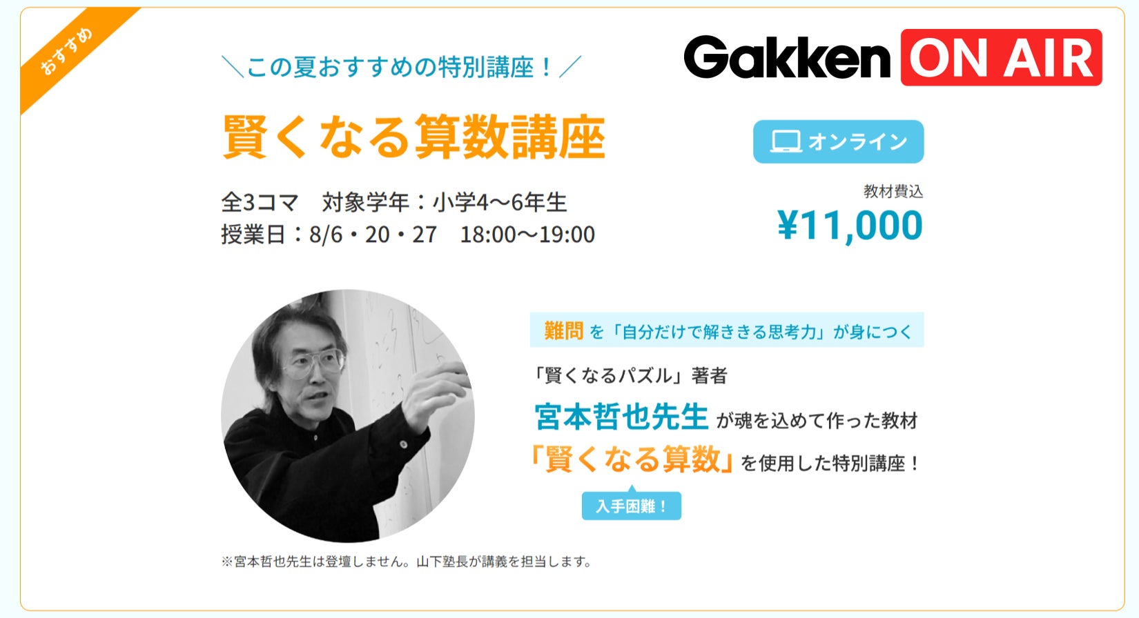 オンライン塾「学研オンエア」が宮本哲也先生と初コラボレーション! 門外不出の教材「賢くなる算数」を使用した特別講座が初登場。