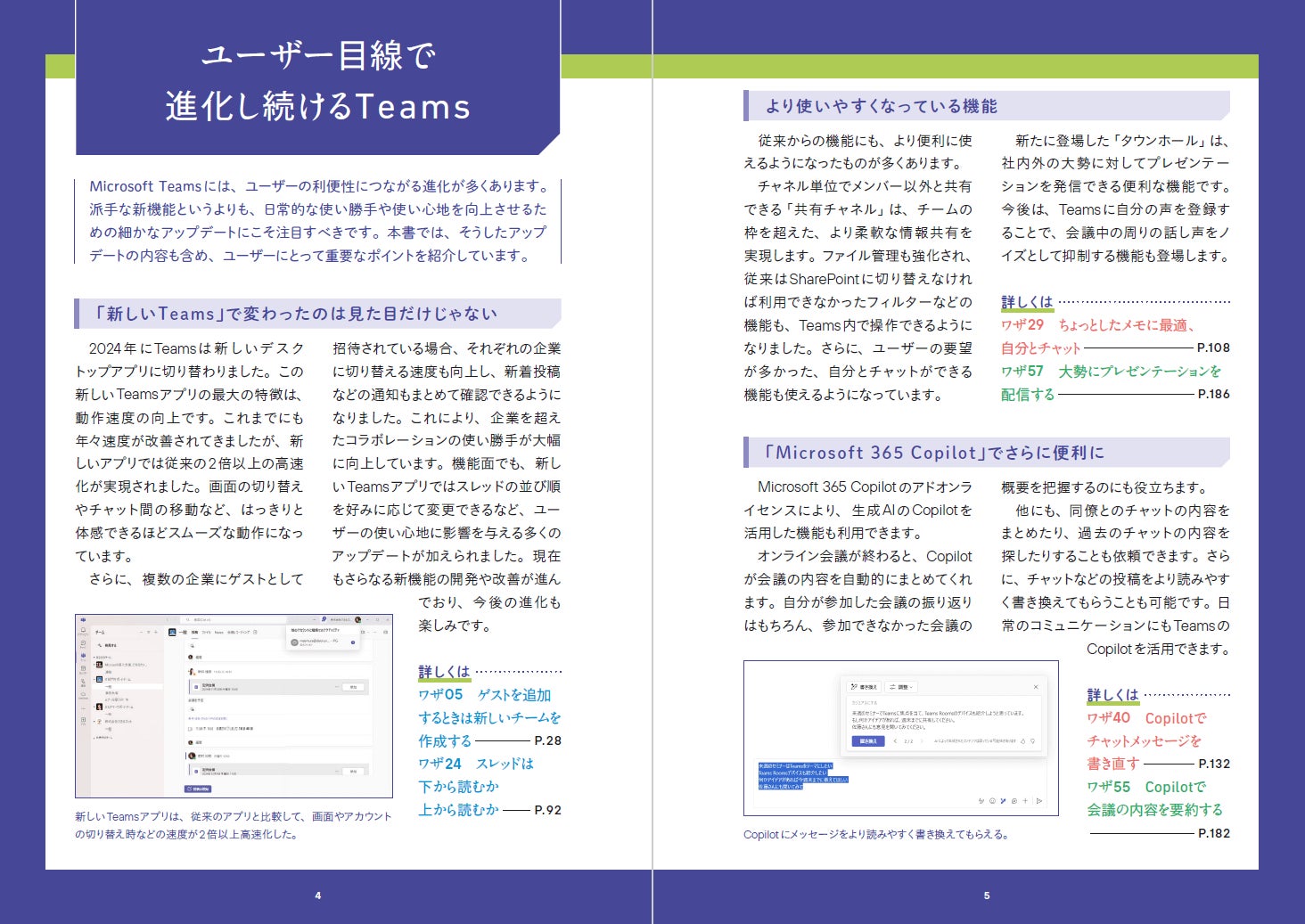本書の旧版である『Microsoft Teams踏み込み活用術 達人が教える現場の実践ワザ(できるビジネス)』は、パンデミックの影響が残り、Teamsの利用においても迷いが生じることが多かった2021年7月に刊行されました。「Teamsをより便利に使える」「Teamsのさらなる活用法が分かる」といった好評をいただき、第5刷の重版出来となりました。一方、Teamsは旧版の刊行以降、2024年には新しいデスクトップアプリ(新しいTeams)に切り替わるなど、さまざまなアップデートが行われています。また、ハイブリッドワークが広がる中で、現在のビジネスシーンにおける新たな悩みや課題も出てきています。