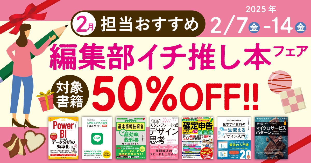 インプレスグループでIT関連メディア事業を展開する株式会社インプレス(本社:東京都千代田区、代表取締役社長:高橋隆志)は、対象の電子書籍が50%オフで購入できる「担当おすすめ!編集部イチ推し本フェア 2025年2月」を2025年2月7日(金)から2月14日(金)まで実施いたします。
