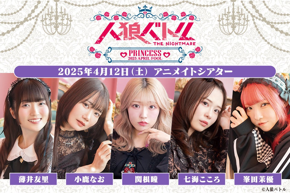 人狼 × キャラクター設定でおくる大好評の人狼バトル!2025年4月12日開催イベントの出演は薄井友里さん・小鹿なおさん・関根瞳さん・七海こころさん・峯田茉優さん!新規撮りおろし写真使用グッズも登場♪