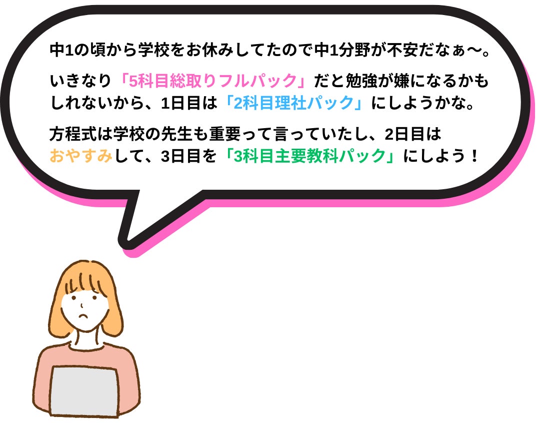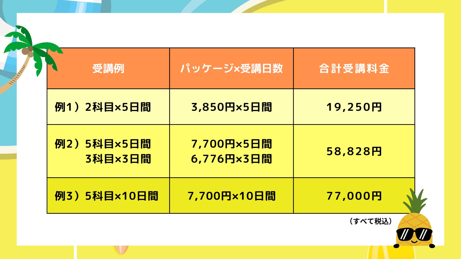 「1日目は基礎の基礎なので2科のみ、2日目は5科、3日目からは家族旅行なので受講しない」なんて受講スタイルも自由自在に組めちゃいます!