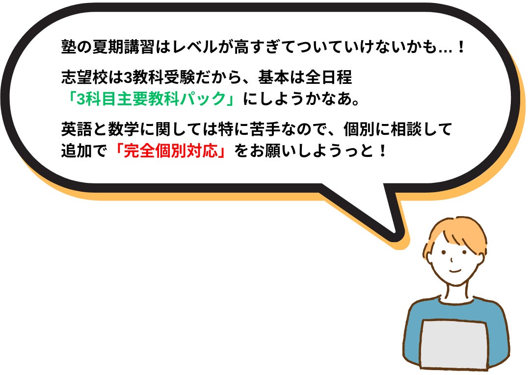 「苦手単元だけを受講したい」「一般の夏期講習は学習進度が合わないかも」「受験へのラストスパートをかけたい」「でも、教室に行けるか不安」