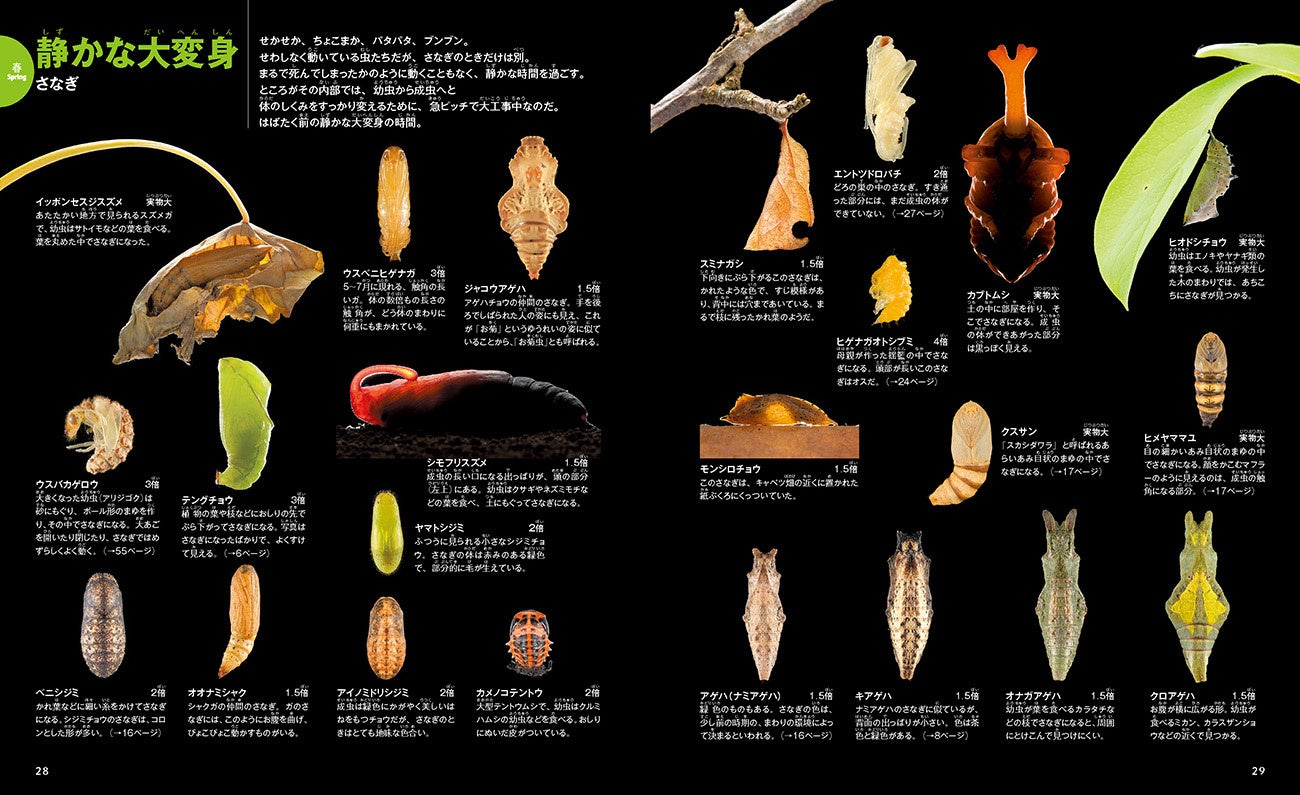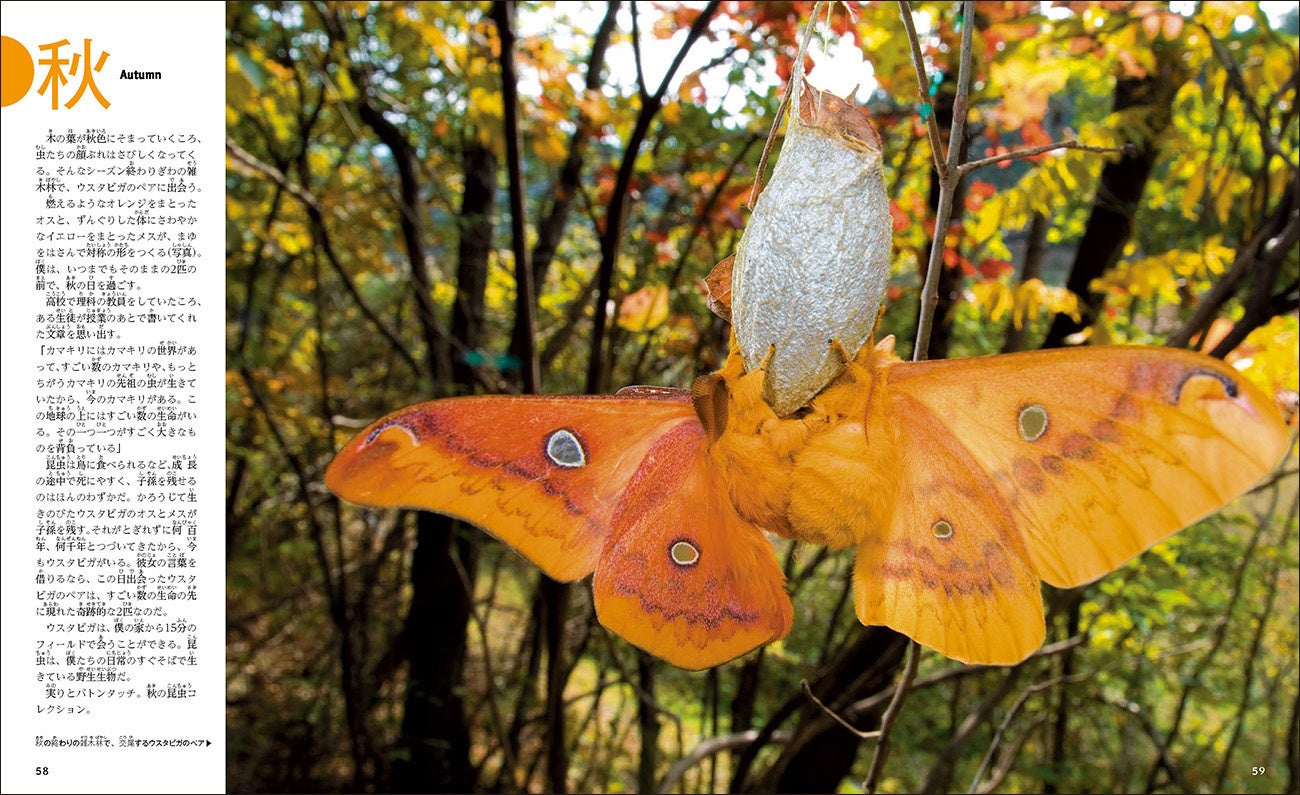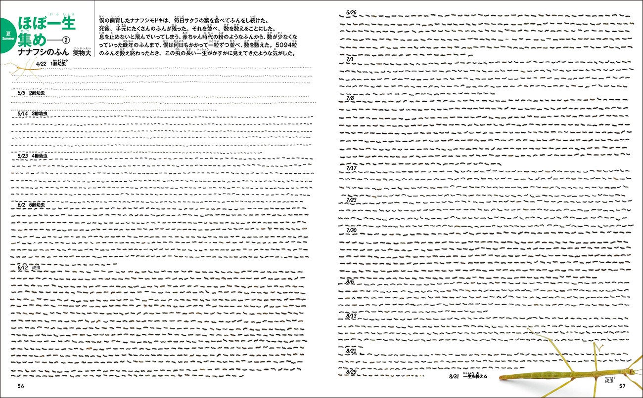 ページを繰る度に、多彩で生き生きとした虫たちの姿や生きざまに圧倒され、身近な虫の思いがけないすごさに気づかされます。虫が一生のあいだに残したものを集めて、虫の一生に近づく試み、題して「一生集めプロジェクト」も必見です。