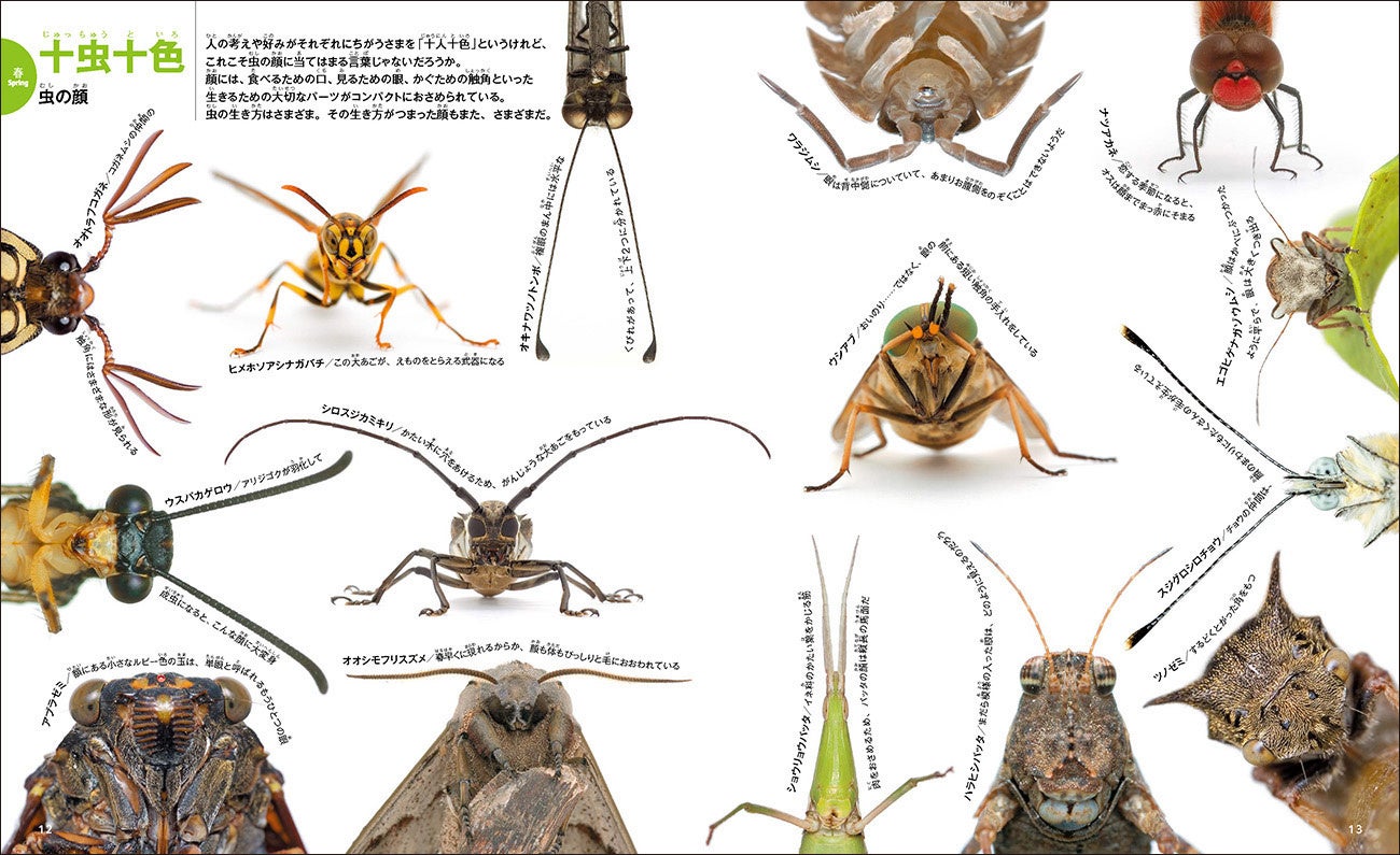 生きもの写真家の安田守さんの視点で集められた、身近な昆虫のすごいところ、おもしろいところを、「赤ちゃん」「顔」「ふん」「ぬけがら」「擬態」など、さまざまなテーマごとにふんだんに紹介しています。