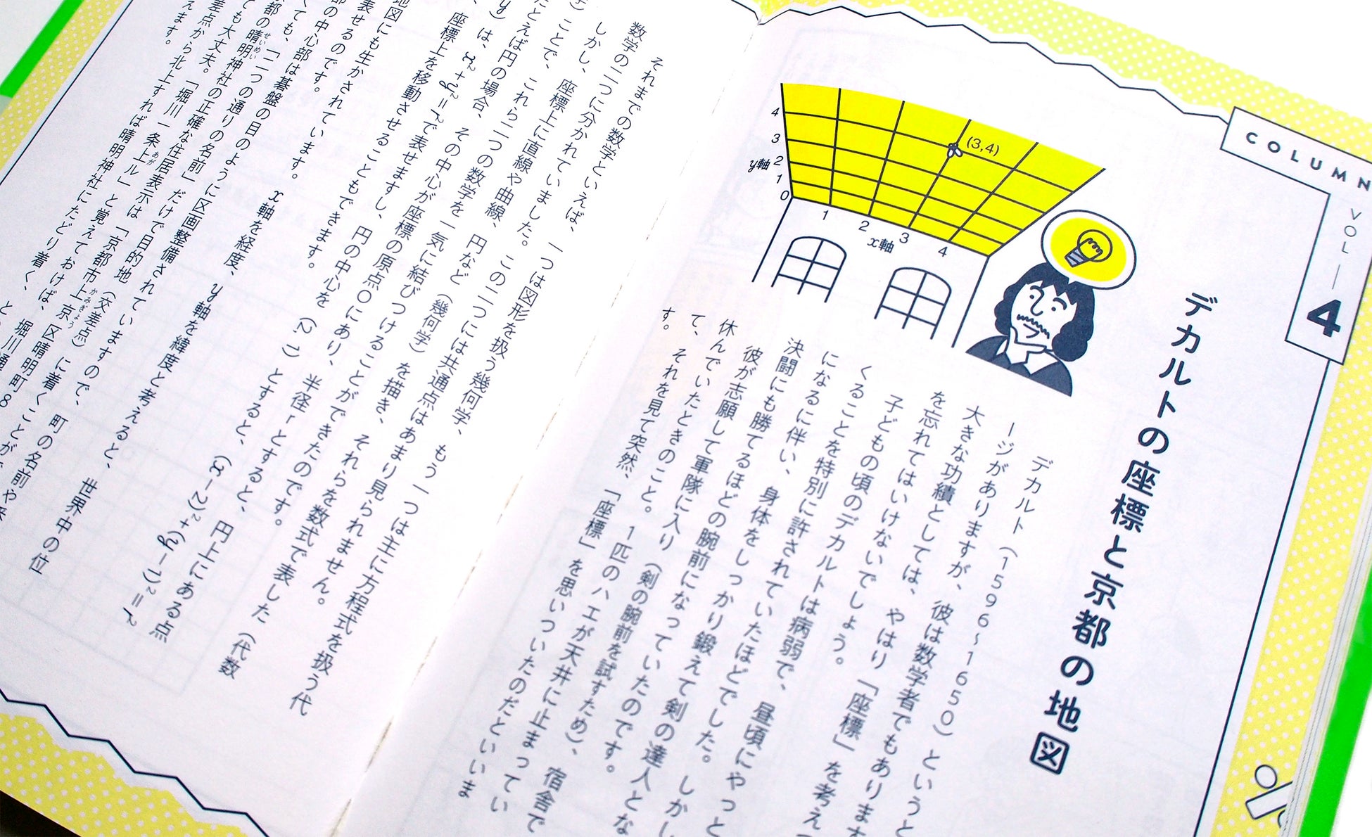 マンガの合間にはコラムも多く掲載しています。執筆をしたのは、本丸諒さん。『数学者図鑑』(かんき出版)、『すごい統計学』(飛鳥新社)などを手掛けた、理系のテーマを文系向けに<超翻訳>する技術に定評のある、サイエンスライターです。「お見合いに方程式がある?」「円グラフはビジネスでは使用注意?」など、上下巻合わせて20本弱掲載されているコラムは読んだら話したくなるものばかりです。