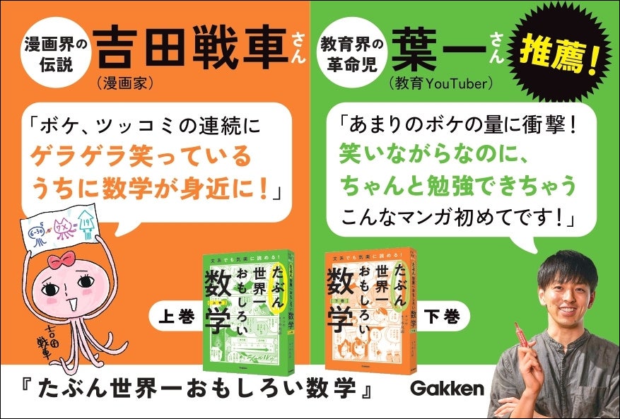おもしろくてわかりやすい本書は、マンガ界のレジェンドからも教育界の革命児からも推薦されています。吉田戦車さんは「ボケ、ツッコミの連続にゲラゲラ笑っているうちに数学が身近になります」と激賞。また、教育YouTuberの葉一さんは「あまりのボケの量に衝撃! 笑いながらなのにちゃんと勉強できちゃう、こんなマンガ初めてです!」と絶賛しています。