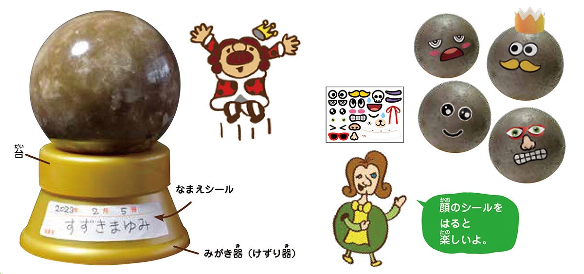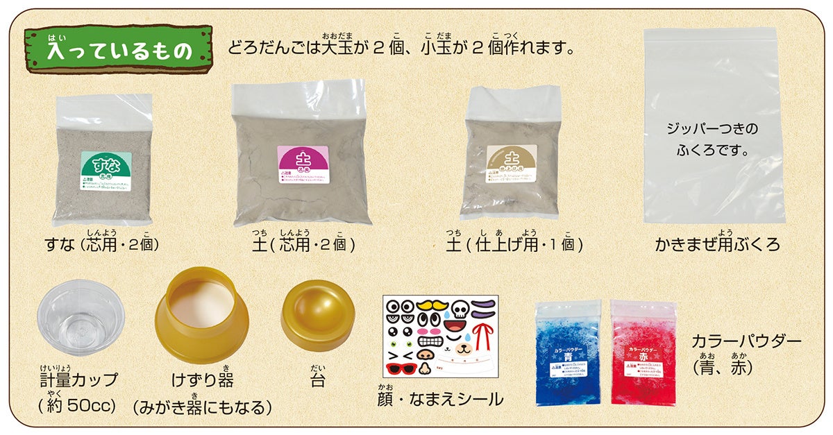 「どろだんご」の常識を超えた、宝石のように光る大玉どろだんごが作れるキット登場! 土、砂、削り器、磨き器、かざり台やシールなどがセットで、すぐにどろだんごを作って、作品として飾れる充実のキットです。