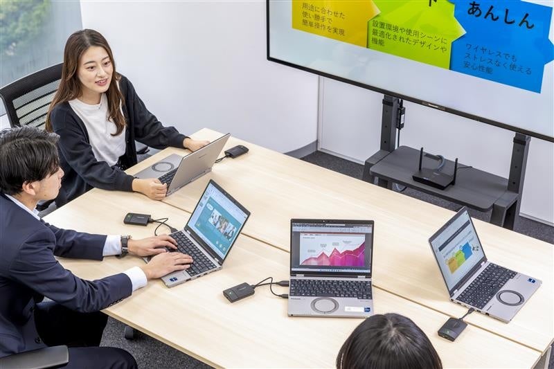 パソコン・タブレット・スマートフォンの画面をワイヤレスで簡単にディスプレイやプロジェクターに表示できるプレゼンテーションシステム。送信機と受信機のシンプルな構成で、送信機を手元の端末に接続するだけで使用が可能。会議中のケーブル受け渡しや座席交代の無駄をなくし、複数人のアイデアを同時に画面共有することも可能にします。