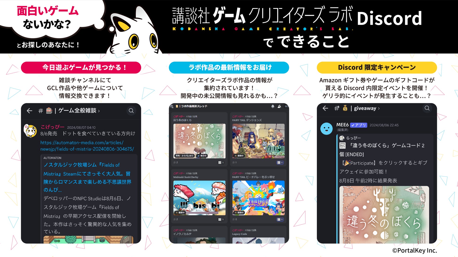 講談社ゲームクリエイターズラボ(以下GCL)は、好きなゲームを語り合いながら、GCL作品の魅力や現在の開発進捗をお伝えするDiscordコミュニティ『KODANSHA GCL (β)』をオープンしましたことをお知らせします。運営会社は『株式会社PortalKey』となっております。