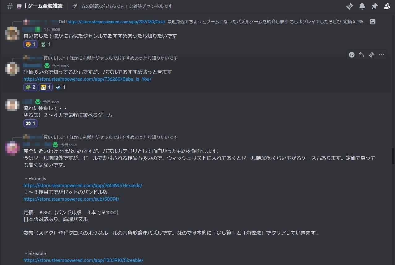 このコミュニティには、気になっているゲームをみんなで語り合う雑談チャンネルや、自分の推しゲーを紹介するチャンネルがあります。きっと今日遊びたいゲームが見つかることでしょう。