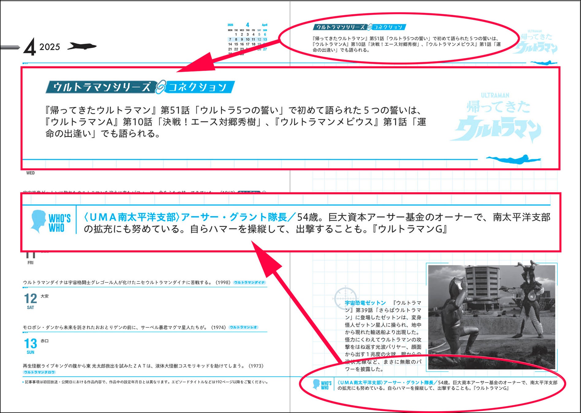 ウルトラマンシリーズをつなぐ超マニアックな関係を解明する「ウルトラマンシリーズ・コネクション」と、防衛チームの隊長・副隊長を特集した「WHO’S WHO」の2つの新コラムを毎週掲載しています。週間スケジュールを書き入れるついでに、お楽しみください。