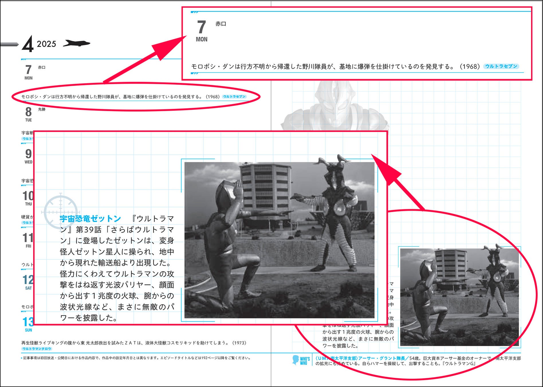 もちろん月間と2つの年間カレンダー、そしてレフト式の週間ダイアリー、『ウルトラQ』から『ウルトラマンアーク』までの作品解説コーナー、ダイアリーで紹介した365作品のデータリストなども、ばっちり充実です。