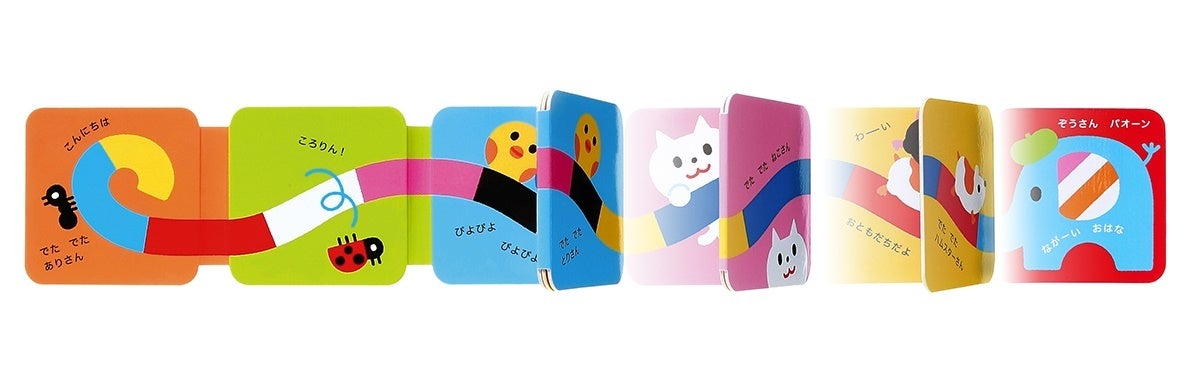 めくって伸ばすしかけによって、「モチーフが増える」「いないいないばあ」「何が出てくるか当てる」「先に進む」など、それぞれの絵本で違った遊びが楽しめます。
