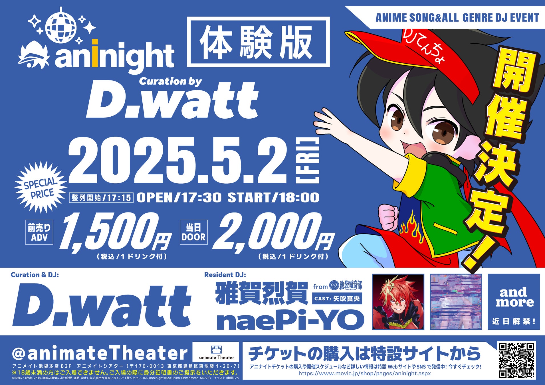 今回の『アニナイト』は、「aninight 体験版 Curation by D.watt」と題し、なんとSPECIAL PRICEの前売り1,500円(税込/1ドリンク込)/当日2,000円(税込/1ドリンク込)で開催決定!
